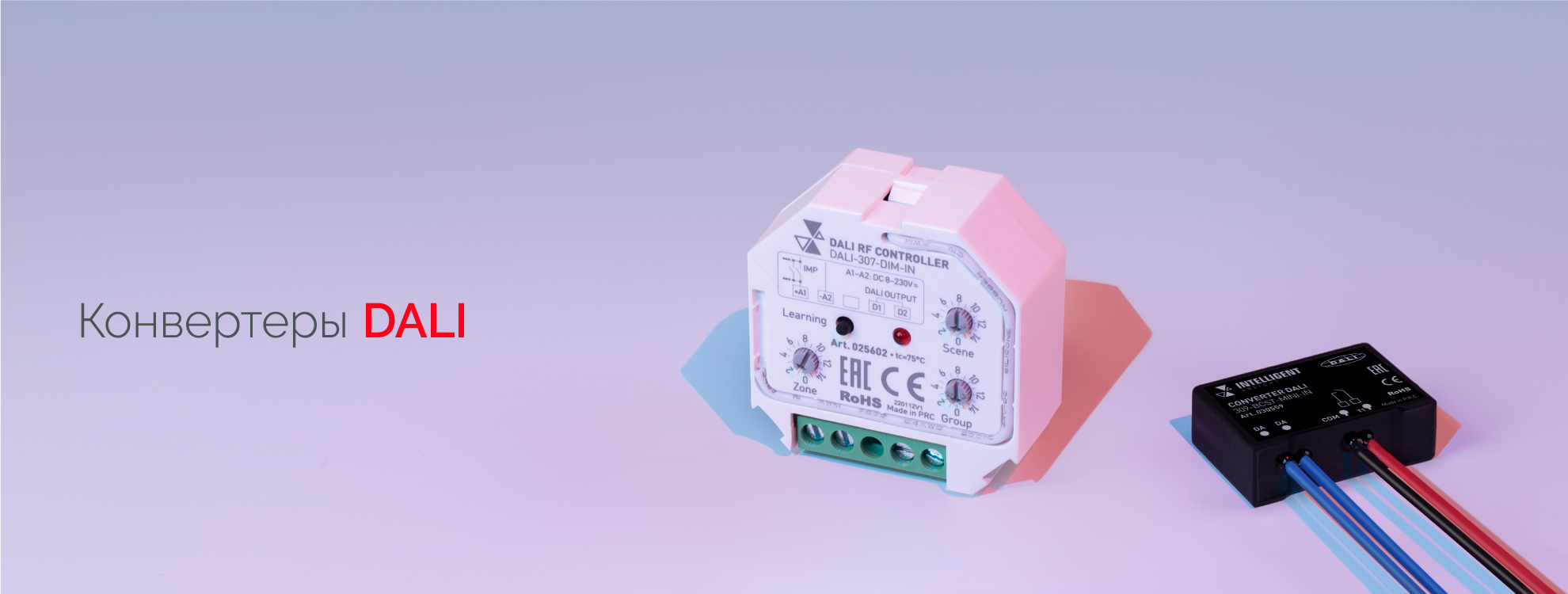 Конвертеры, использующие цифровой интерфейс передачи данных DALI. Представлены устройствами для преобразования сигнала, отправленного по шине DALI, в сигнал управления, доступный для устройств, работающих в других протоколах управления, а также устройствами преобразования сигнала от внешних кнопок звонкового типа и пультов в цифровой сигнал DALI.