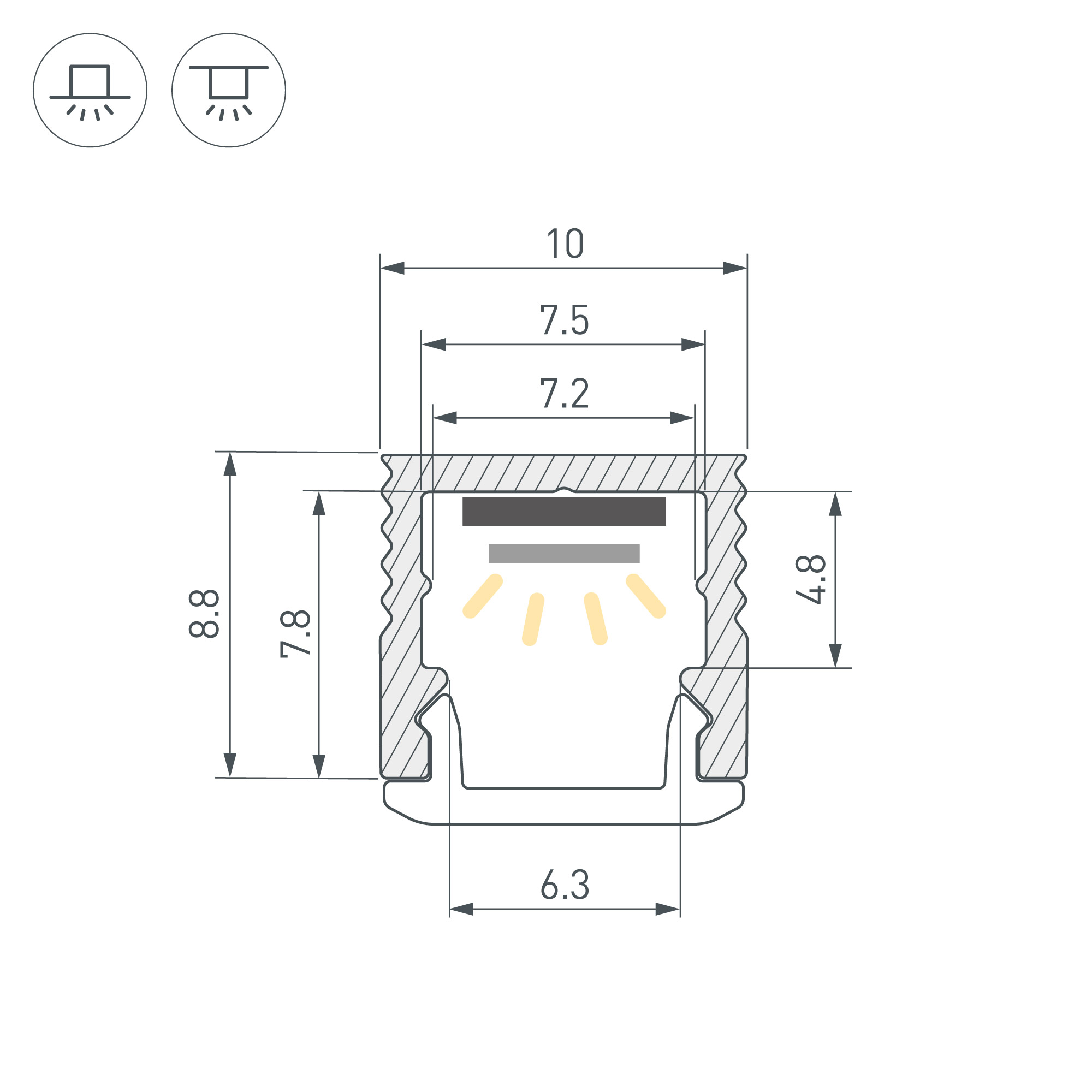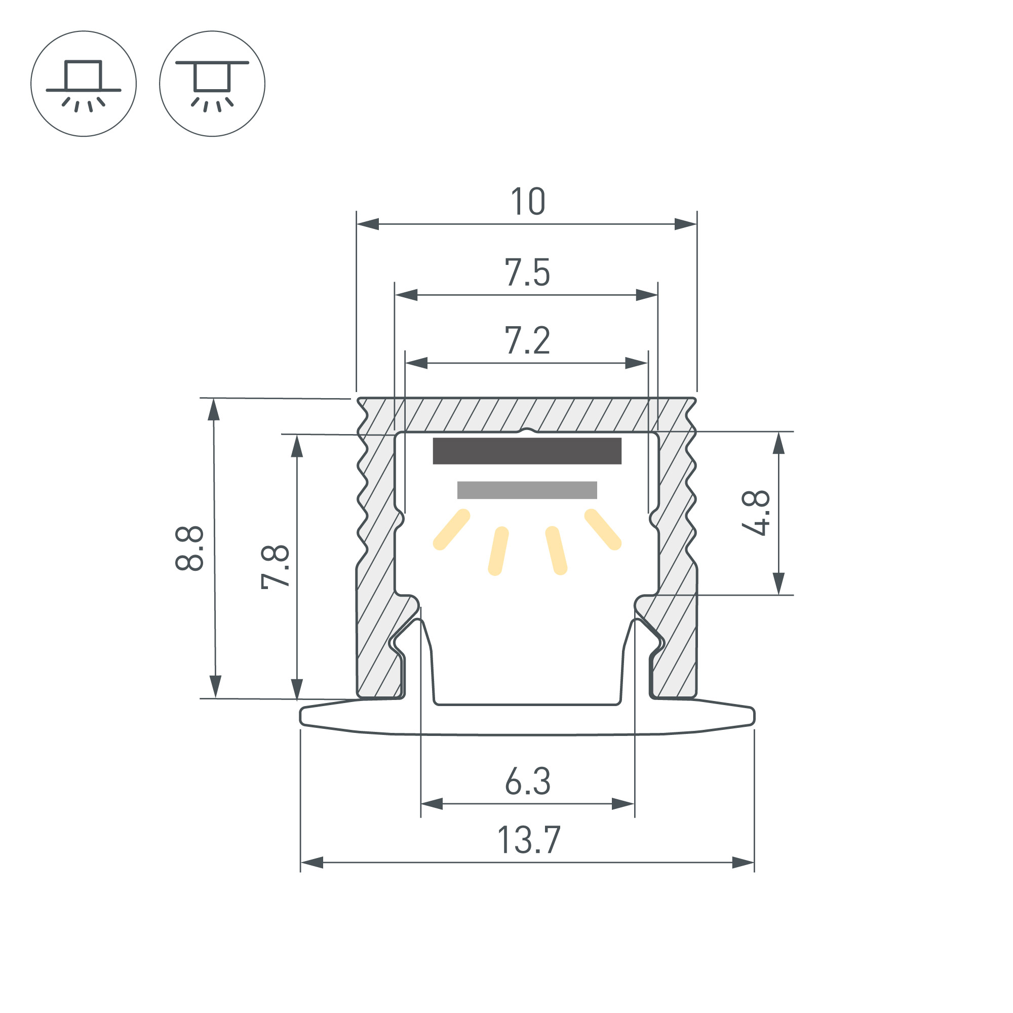Накладной/встраиваемый микро-профиль из анодированного алюминия для подсветки мебели, пазов, ниш и других элементов интерьера. В зависимости от выбранного экрана профиль можно как установить на поверхность, так и встроить в неё. Габаритные размеры профиля составляют 2000 мм в длину, 10 мм в ширину и 8,8 мм в высоту. Площадка для установки светодиодных лент позволяет использовать ленту шириной до 7,5 мм и мощностью до 10 Вт/м. Это обеспечивает гибкость в выборе светодиодных лент и создает потрясающие световые решения. Экран, заглушки и другие аксессуары не включены в комплект и приобретаются отдельно. Цена указана за 1 метр профиля. Отличное решение для создания современных световых проектов.