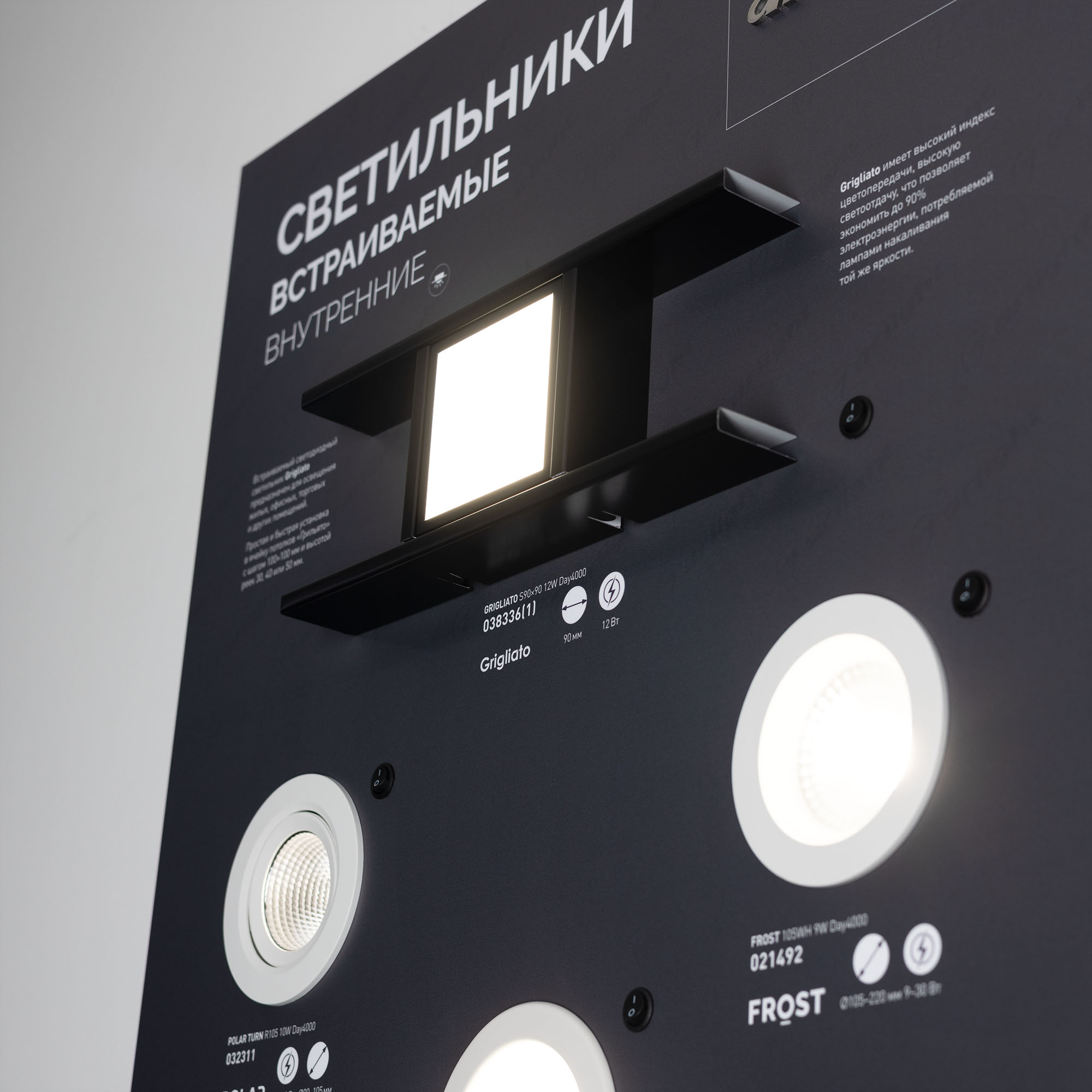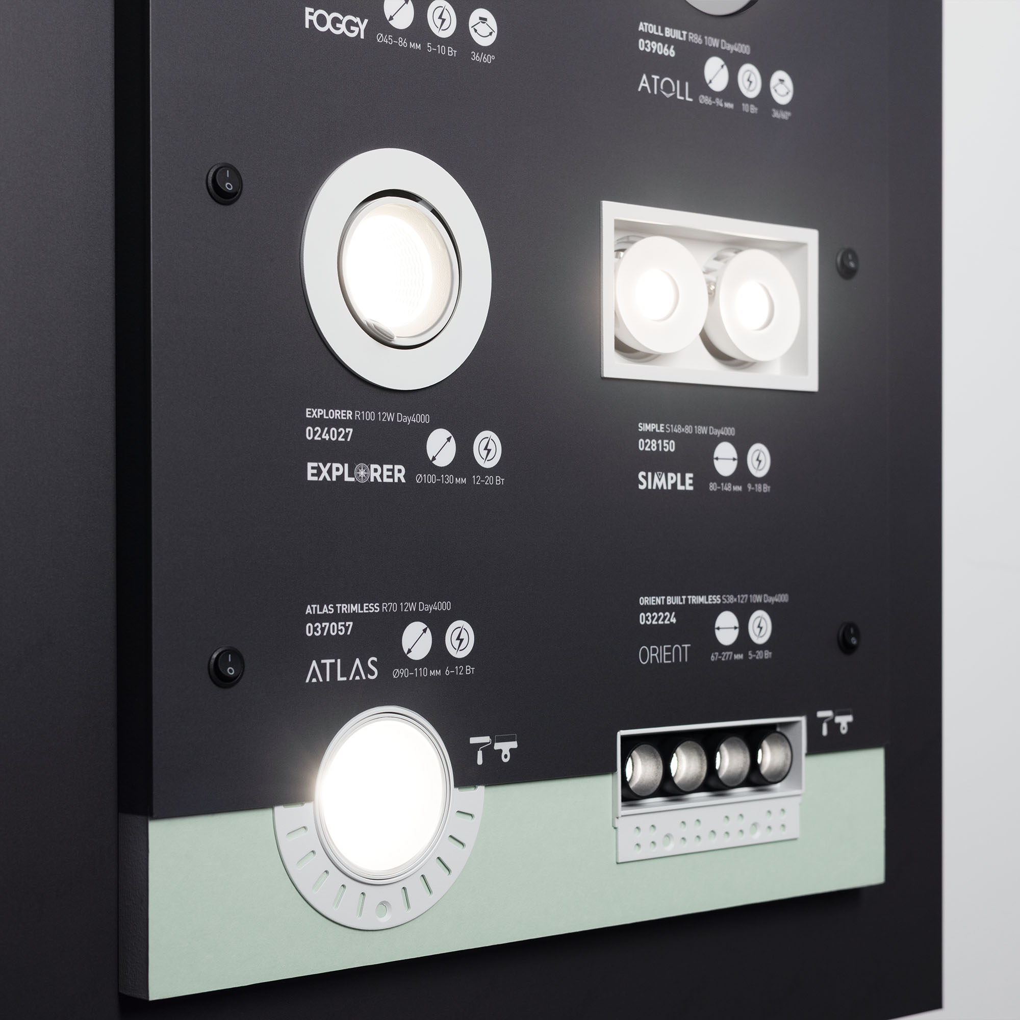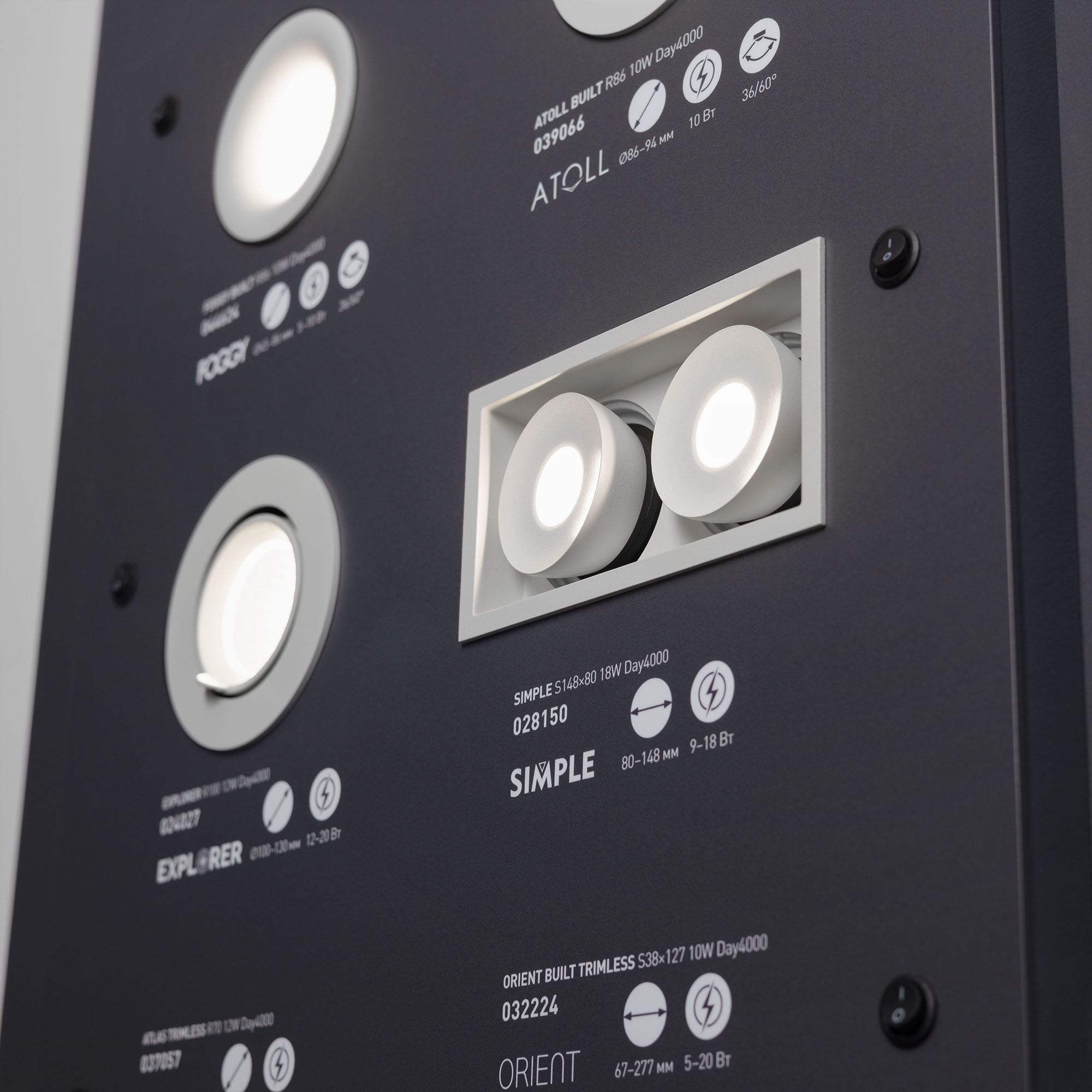 На стенде представлены самые ходовые модели даунлайтов серий FROST, CYCLONE, BREEZE, POLAR, DROP, LTD, BLIZZARD, MIST, EXPLORER, SIMPLE, ATLAS TRIMLESS, ORIENT BUILT TRIMLESS, GRIGLIATO, GLORY, FOGGY, ATOLL.