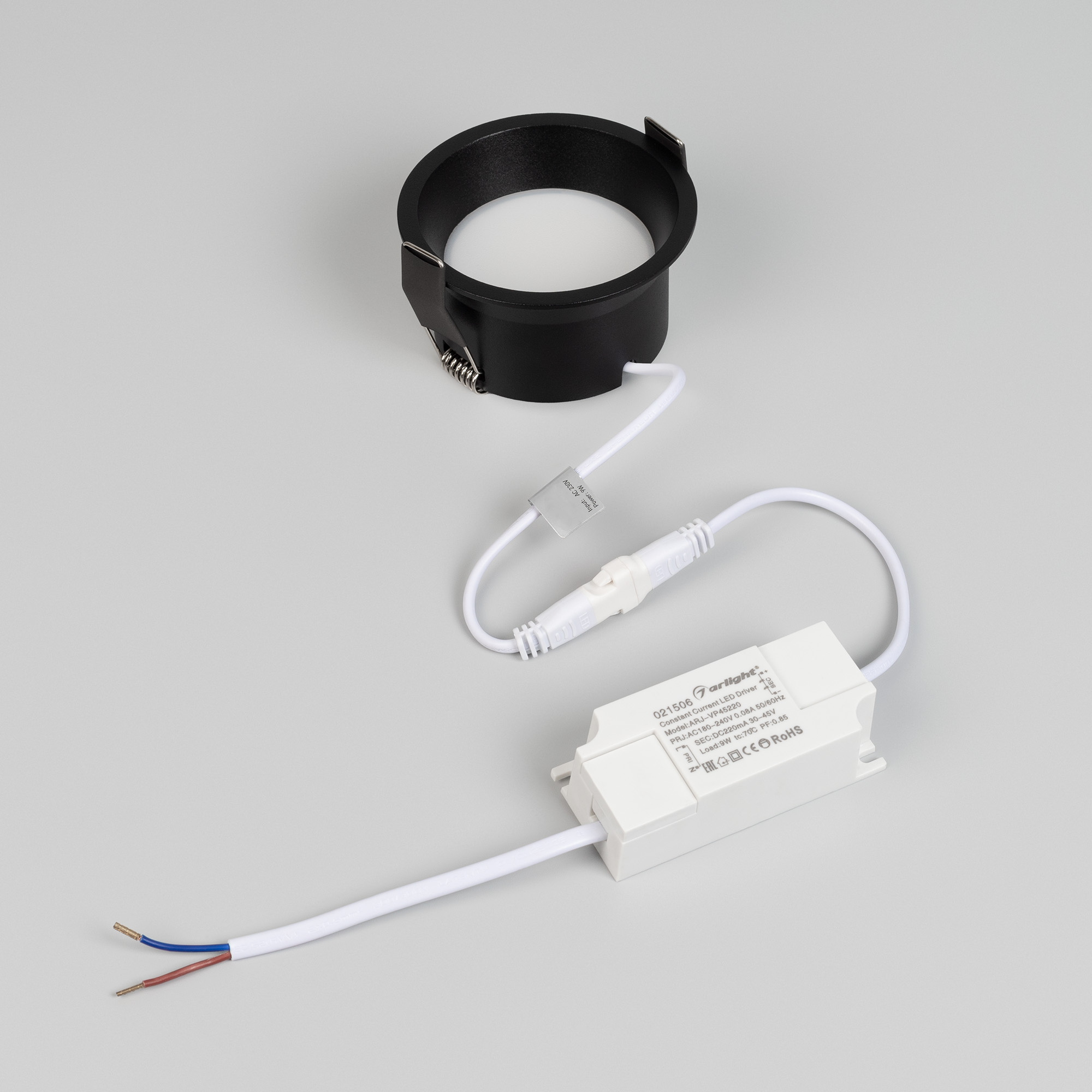 Встраиваемый светильник даунлайт. Мощность 9 Вт, св. поток 500 лм, 56 лм/Вт, тёплый 2700 K, CRI>90, угол 80°, напряжение питания 230 В. Чёрный круглый корпус из алюминия, степень защиты IP20. Размер: диаметр 82 мм, высота 46 мм. Монтаж встраиваемый, установочное отверстие: диаметр 75 мм. Драйвер 27-42 В, 200 мА, пульсация <2%.