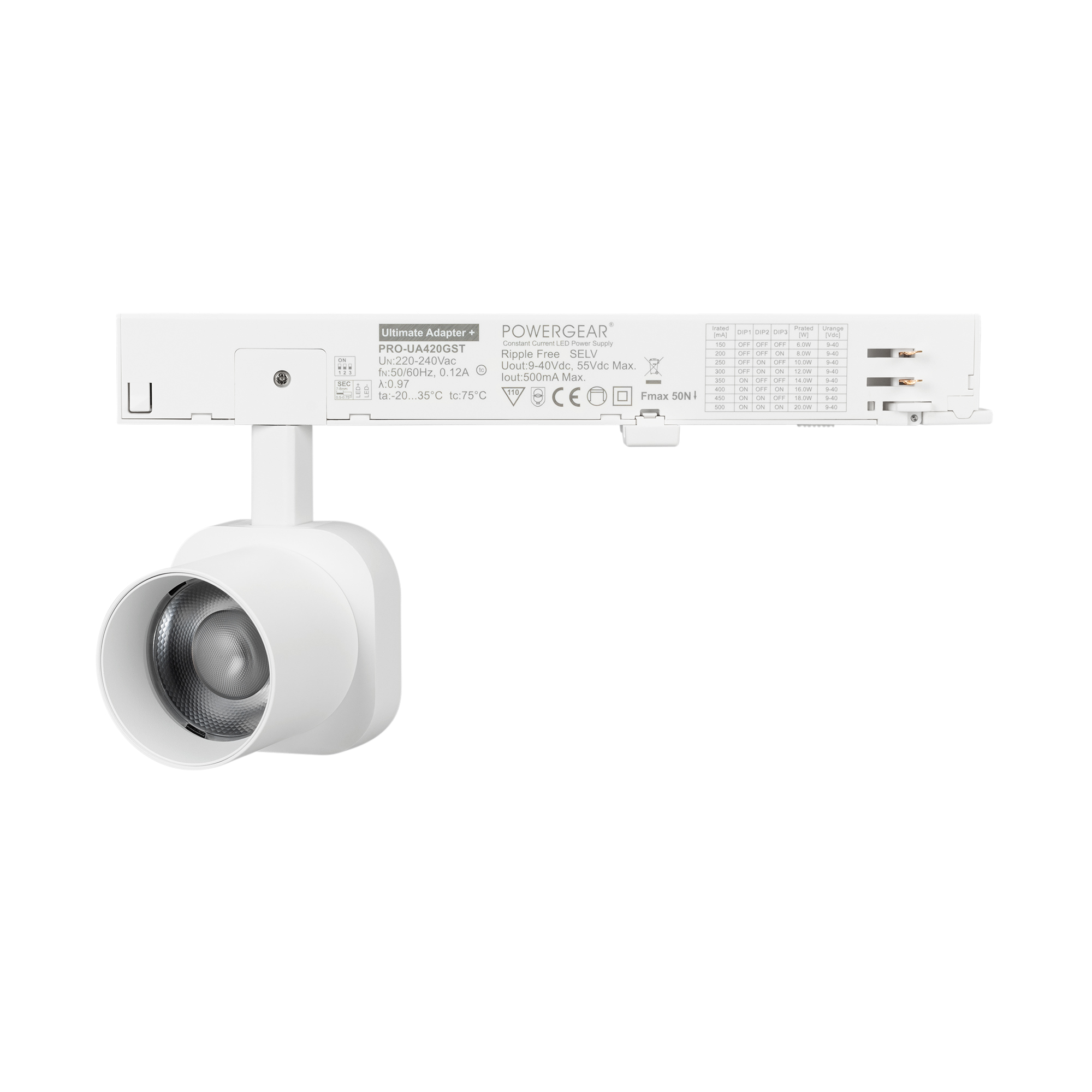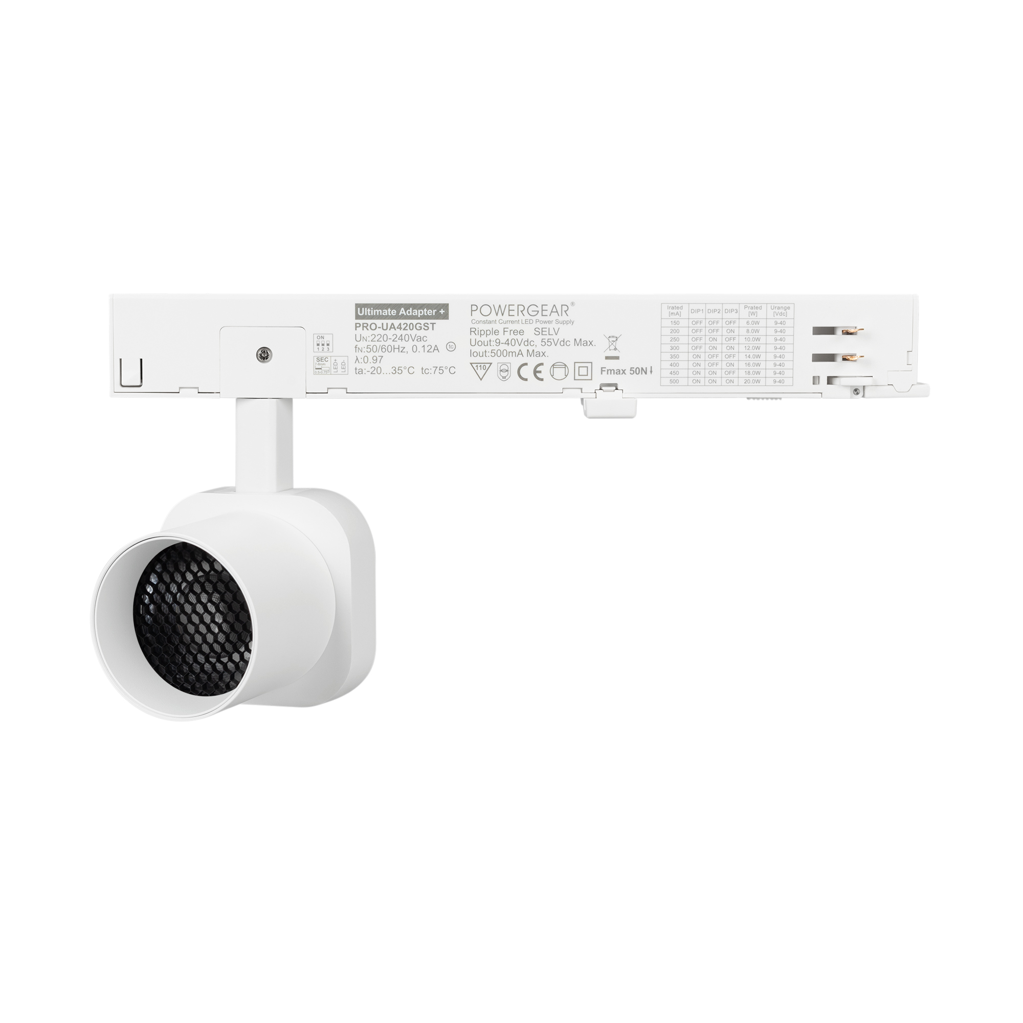 Светильник для треков/шин 4 провода. Мощность 10 Вт, св. поток 740 лм, 74 лм/Вт, теплый 3000 K, CRI>95, угол 60°, напряжение питания 230 В. Решетка HONEYCOMB в комплекте. Белый квадратный корпус из алюминия, материал линзы PC поликарбонат, степень защиты IP20. Размер световой части 60х60х62 мм. Монтаж на трек 3-фазный. Драйвер встроенный 9-40 В, 250мА., пульсация <1%