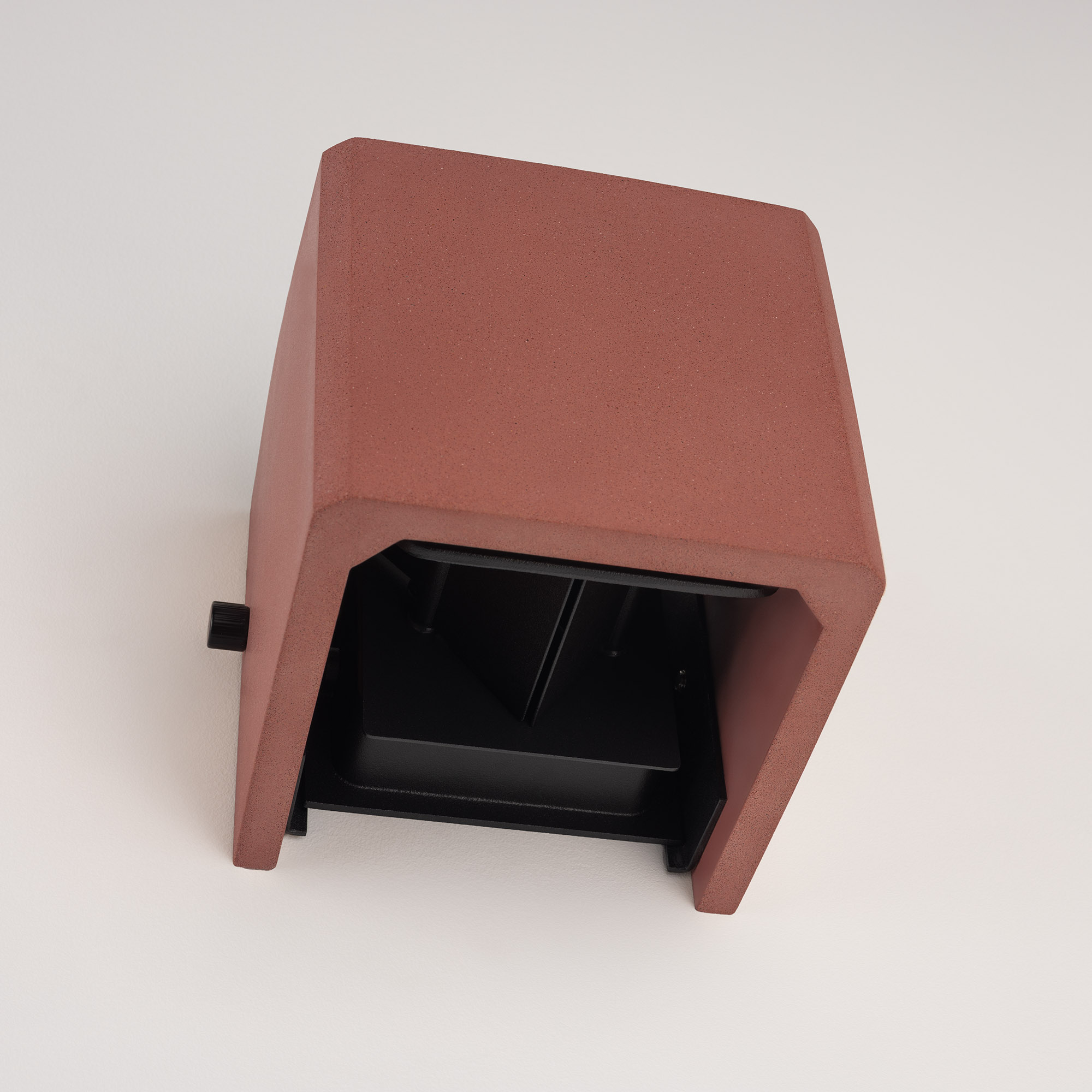 Накладной настенный светильник, свечение вверх/вниз. Мощность 6 Вт, св. поток 286 лм, 49 лм/Вт, теплый 3000 K, CRI>90, изменяемый угол освещения 0°-80°, напряжение питания 230 В. Фигурный корпус из бетона бежево-красного цвета и алюминия, экран ударопрочный PC, степень защиты IP65. Размер: длина 120 мм, ширина 120 мм, высота 120 мм. Монтаж накладной. Драйвер встроенный, пульсация <0.5%.