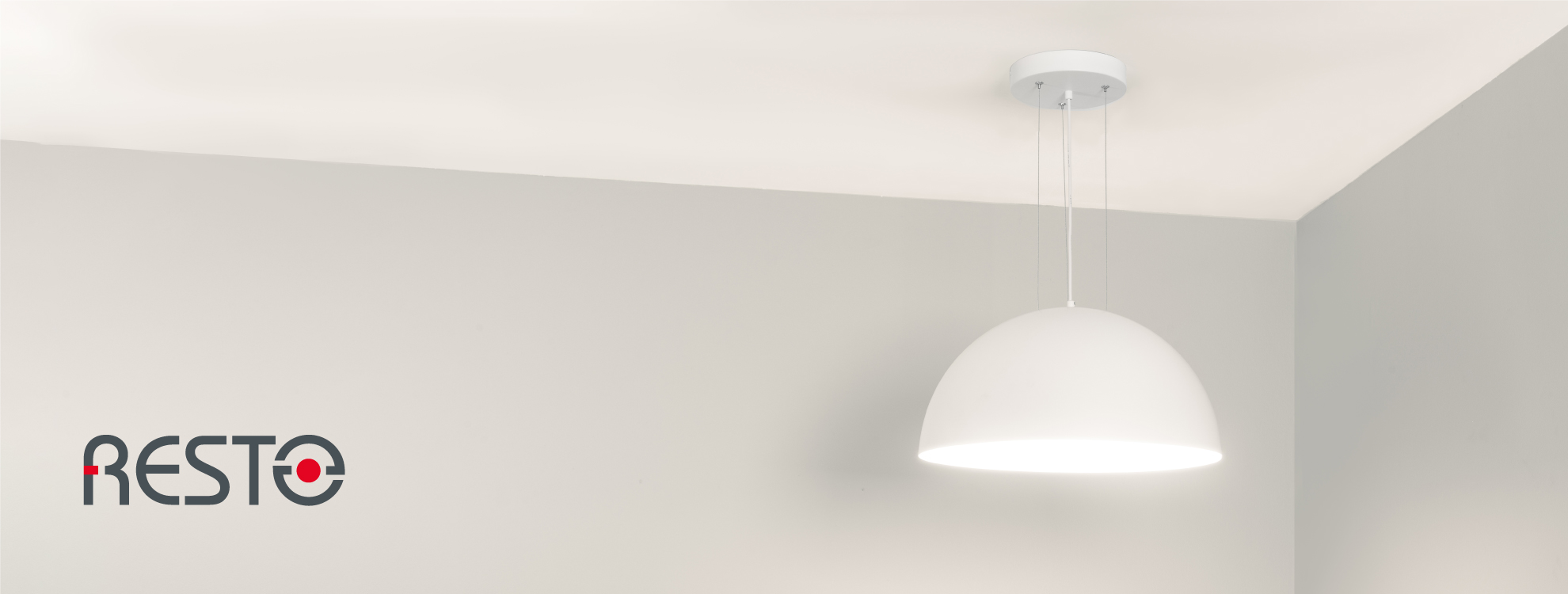 Подвесные светильники RESTO — стильное решение для кухни и кафе в скандинавском стиле. За счет массивного корпуса в форме полусферы создается яркое локальное освещение. Светильник крепится к потолочной чаше с помощью питающего провода и трех тросиков.