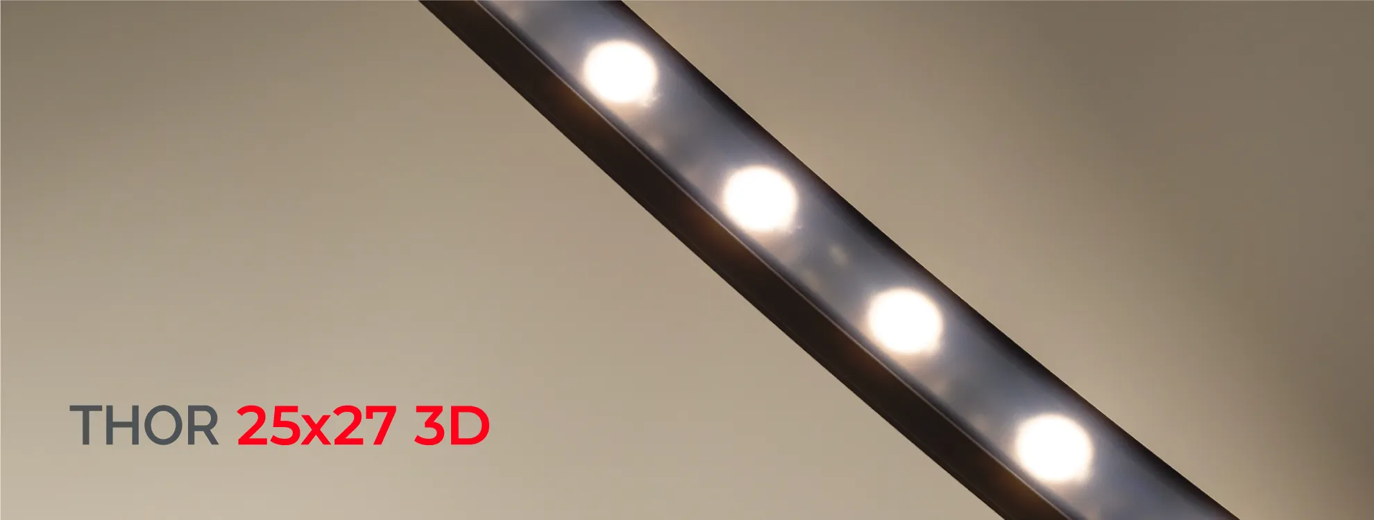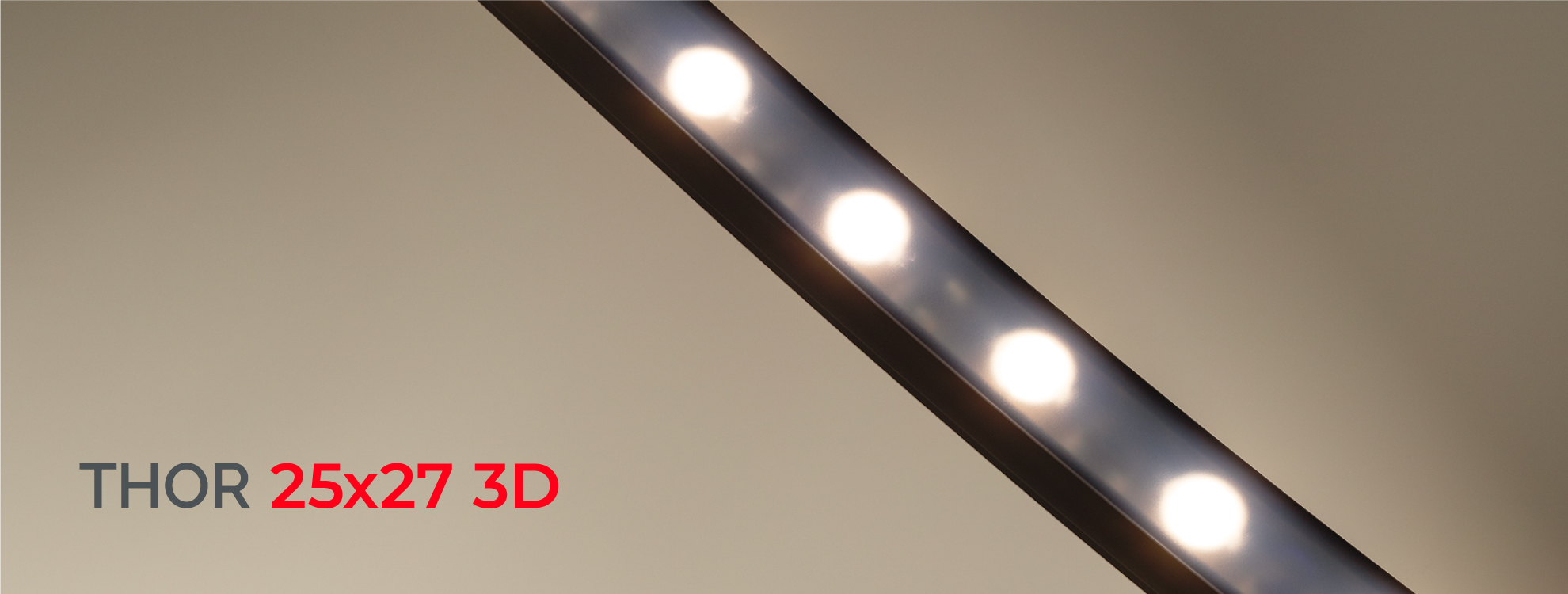 Грейзеры THOR — новая эра в фасадном освещении. Изделия представляют собой светодиоды в герметичной прозрачной оболочке из силикона. Благодаря узкому углу излучения (35°) и линзованной оптике грейзеры создают плотный направленный световой поток, который контрастно подсвечивает фасад здания.