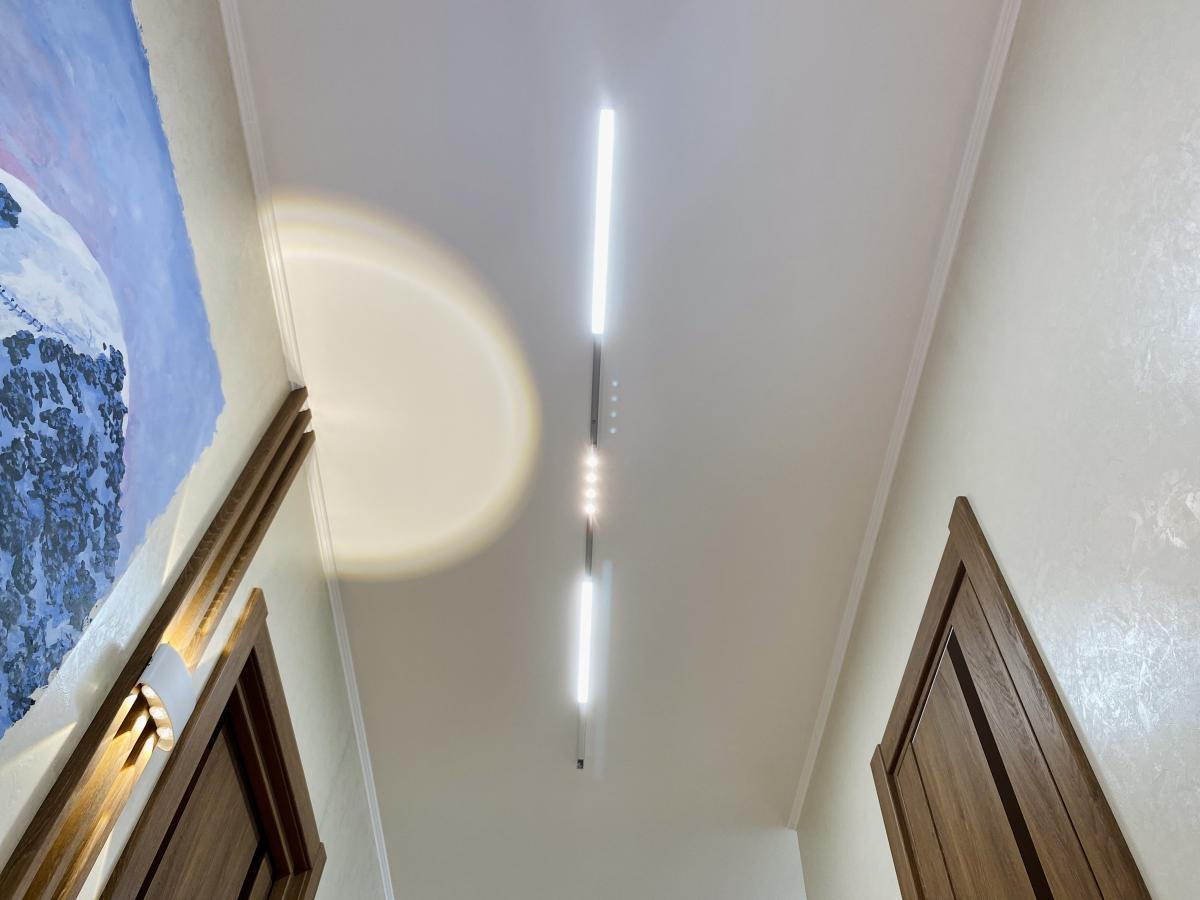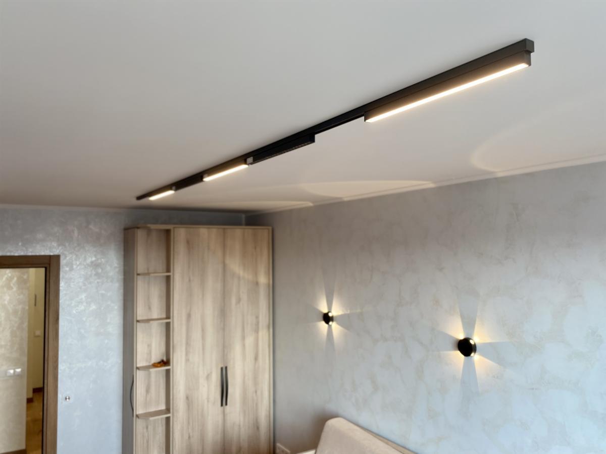 В коридоре мы использовали накладной магнитный трек ORIENT от бренда Arlight, с установленными на него линейными светильниками MAG-ORIENT в прямоугольном корпусе с матовым рассеивателем и высоким индексом цветопередачи (CRI>90) для организации общего освещения.