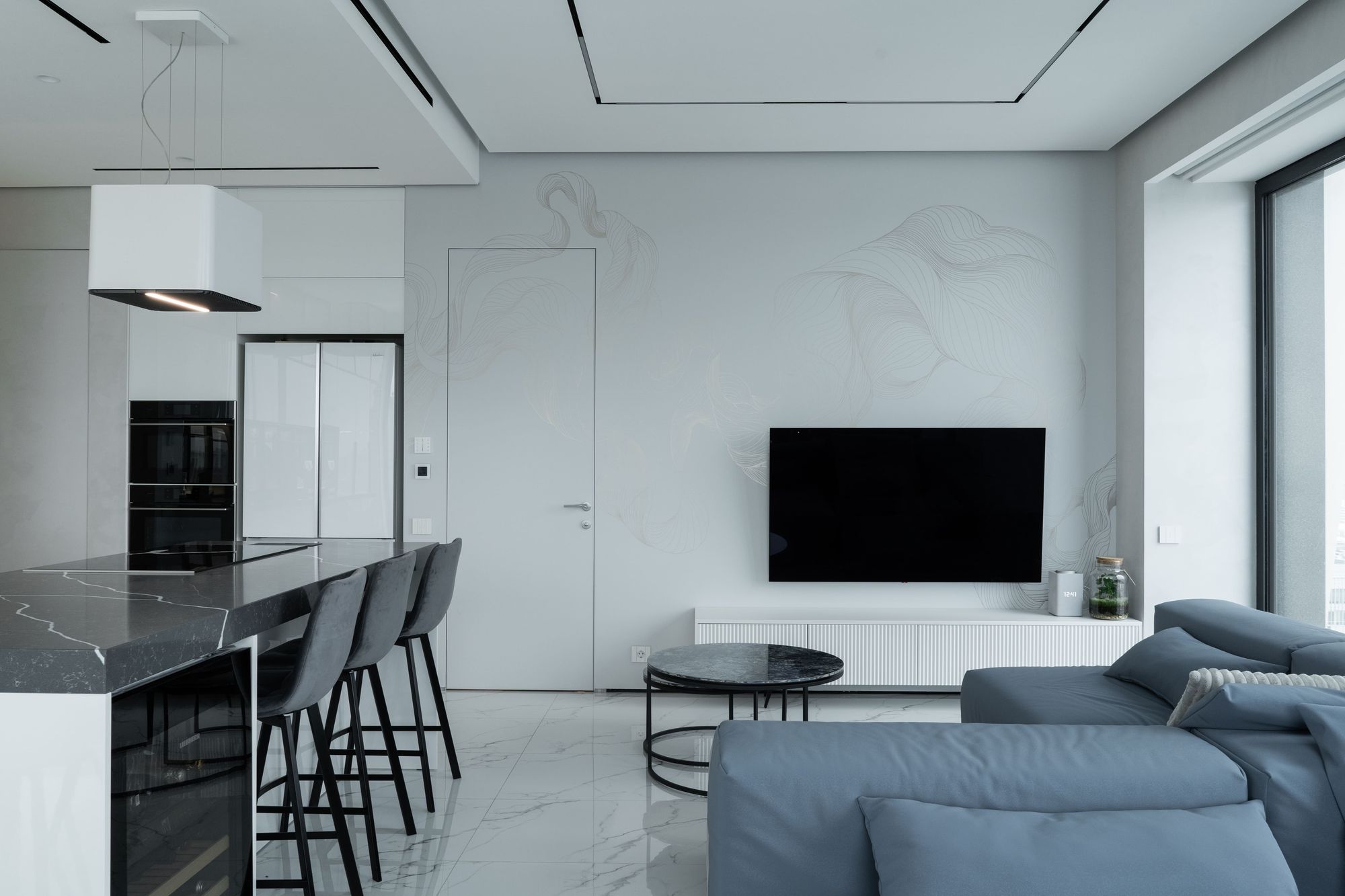 Квартира в многоквартирном элитном доме выполнена в монохромной цветовой гамме и является уютным и эргономичным пространством для семьи из пяти человек. Интерьер выдержан в благородных серых, белых и бежевых оттенках, которые не утомляют даже в больших пространствах.