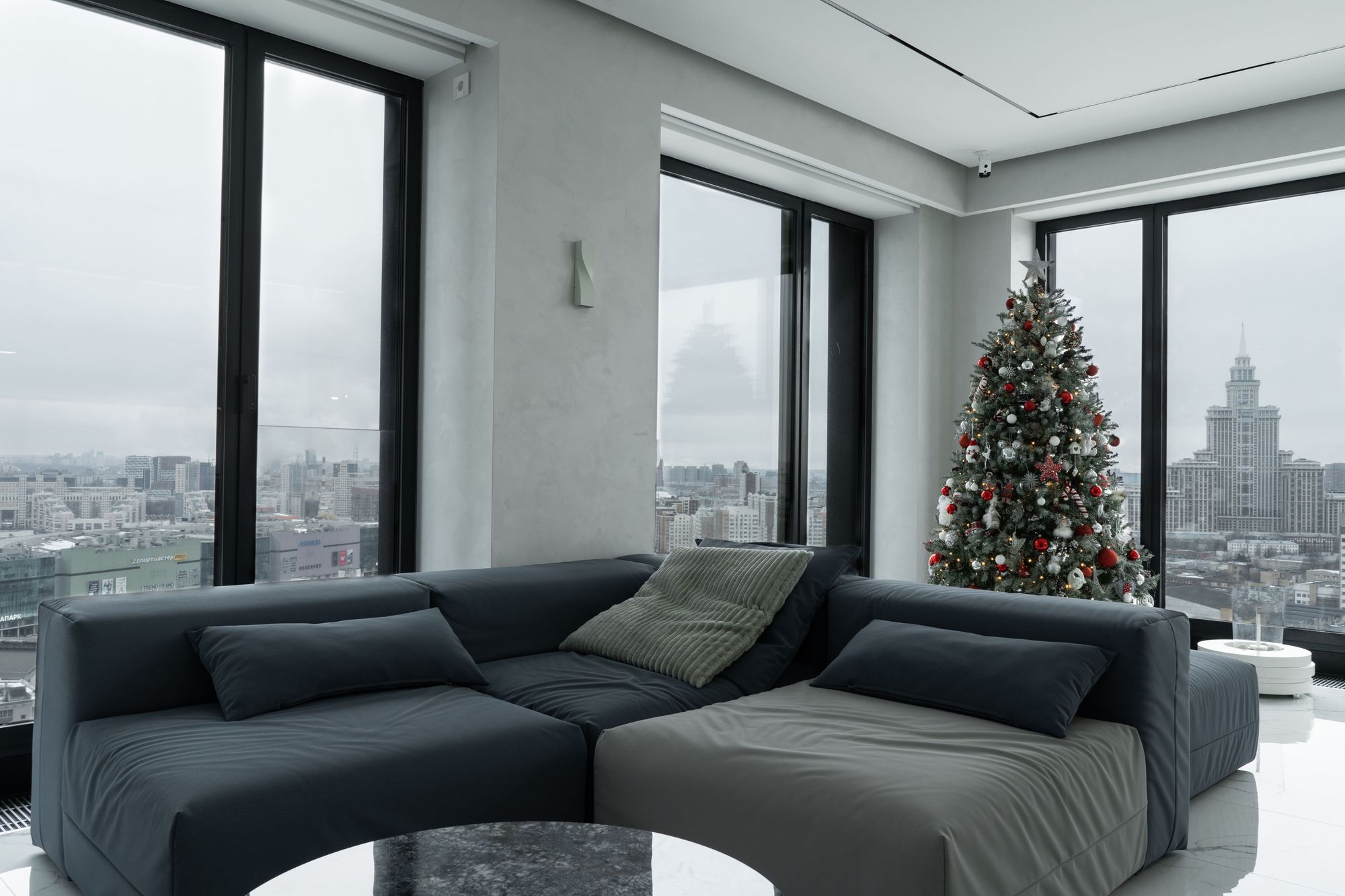 В каждой комнате — квадратное панорамное окно, пропускающее внутрь много естественного света, что является одновременно и вызовом, и возможностью для светодизайна. В кухне-гостиной встроенная линия трека повторяет геометрию окон, а установленные в шинопровод светильники полностью интегрированы в потолок и практически незаметны.