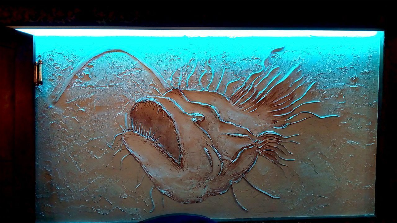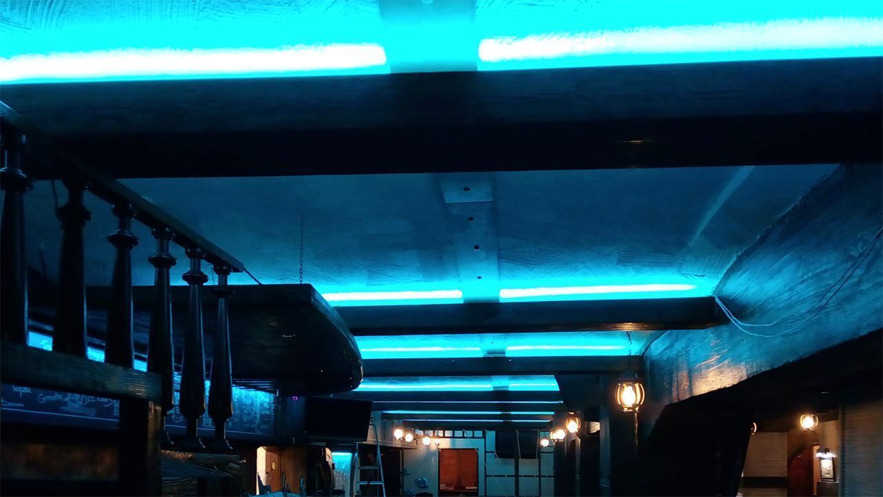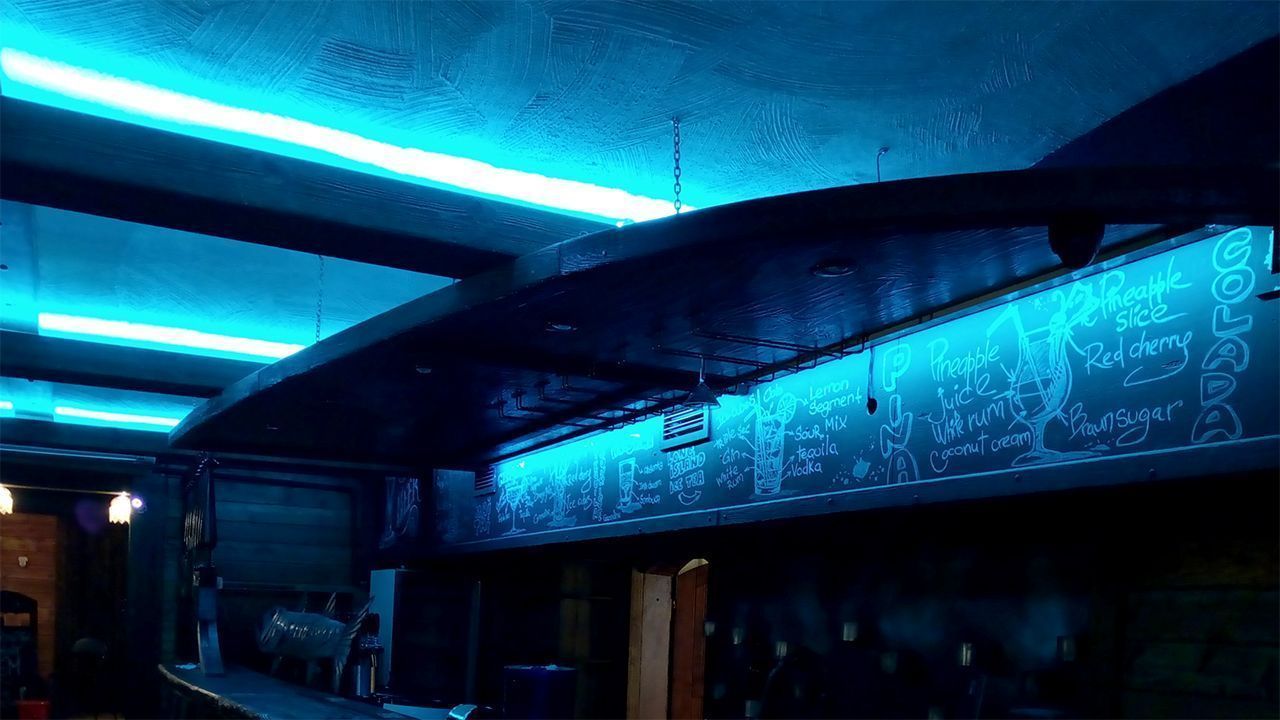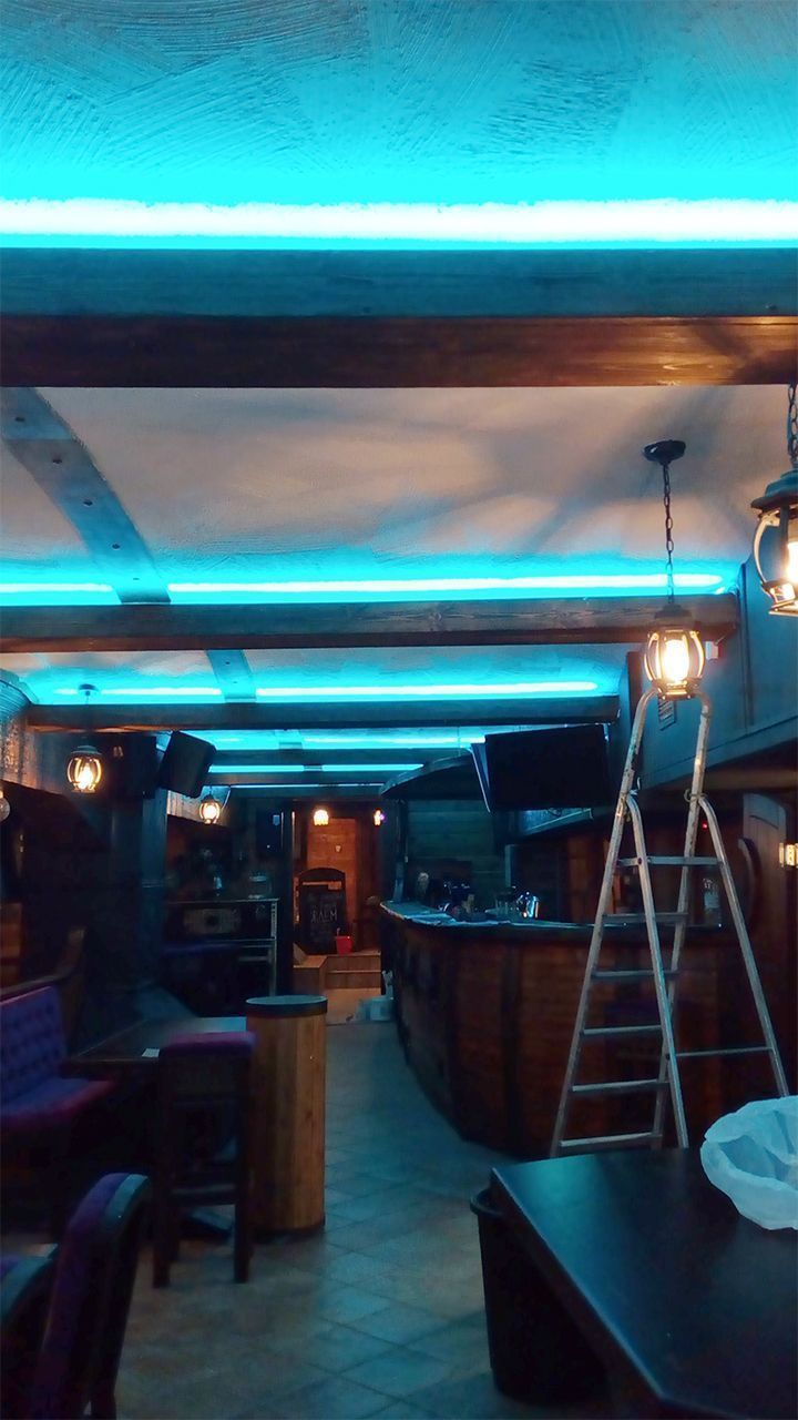 Подчеркнуть выбранную стилистику призвана светодиодная подсветка, которая создала эффект нахождения под водой. Для этого светодиодная лента RGB arlight® была установлена в декоративные, имитирующие дерево, балки под потолком. Лента была также установлена для освещения стенки вентиляционного короба, который одновременно служит для написания барного меню.