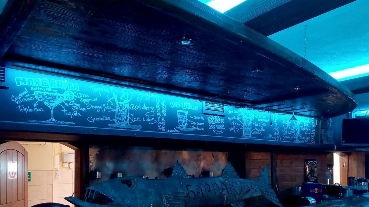 "Морскую" атмосферу создала в баре светодиодная подсветка бирюзового цвета.