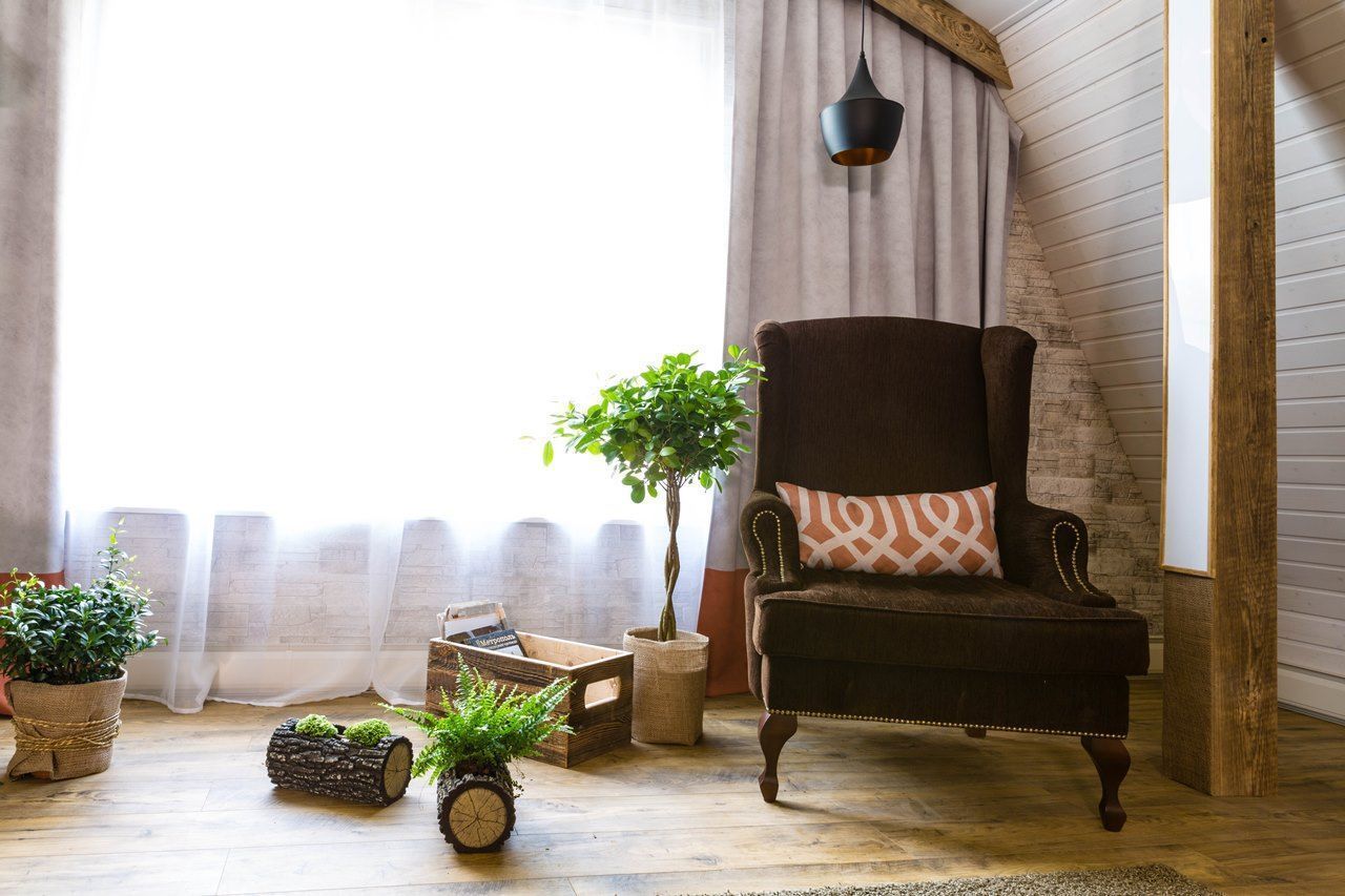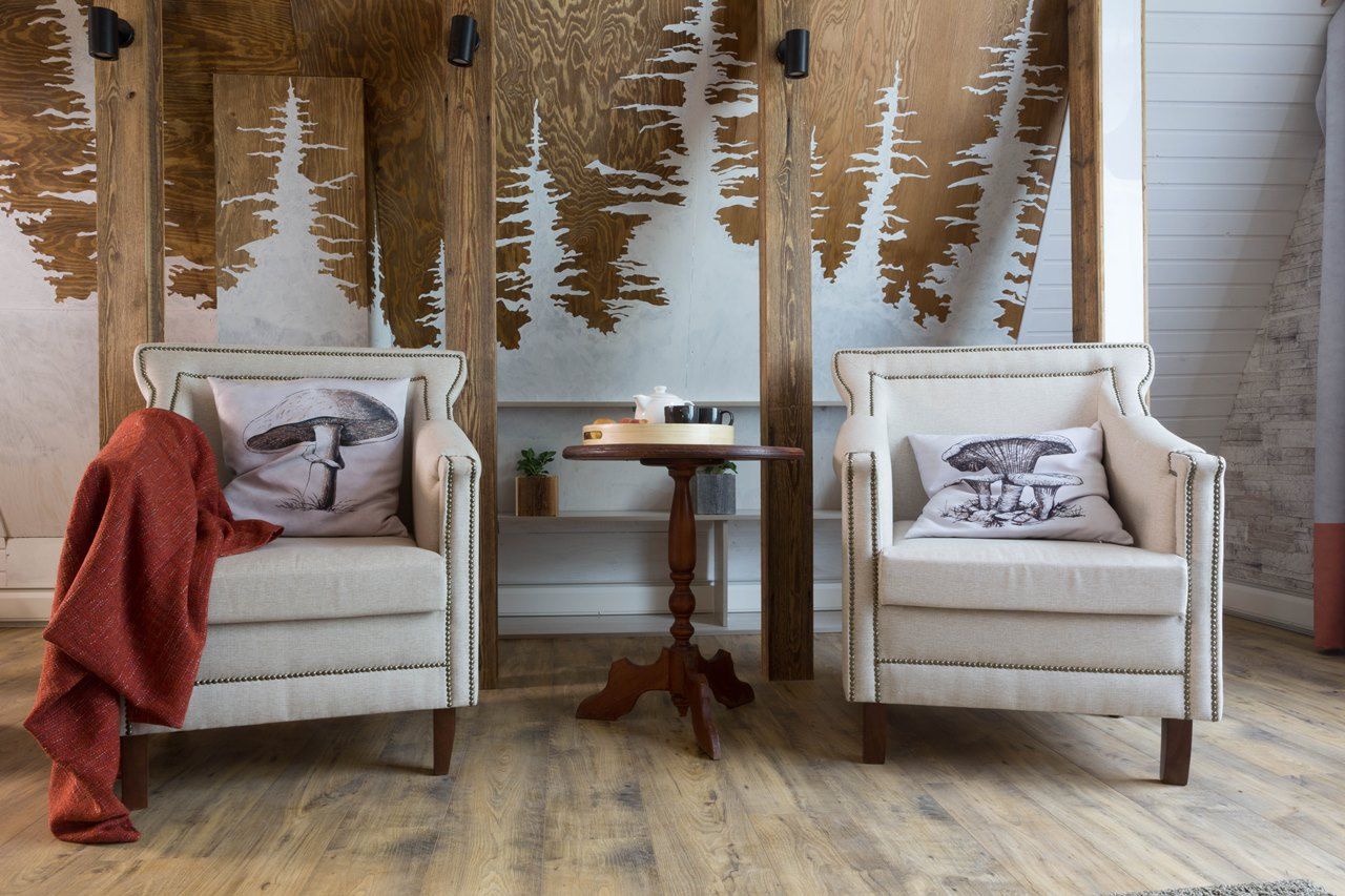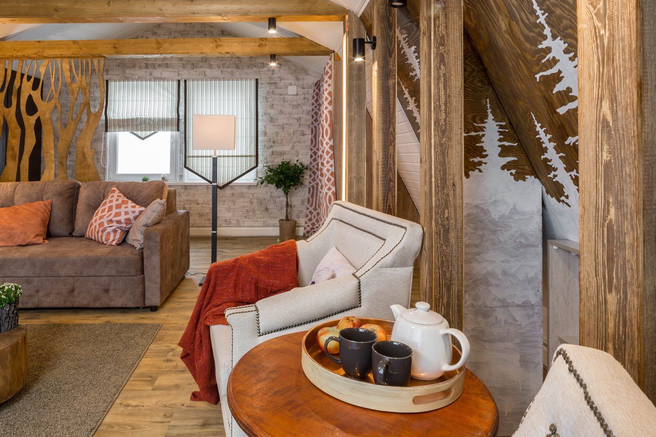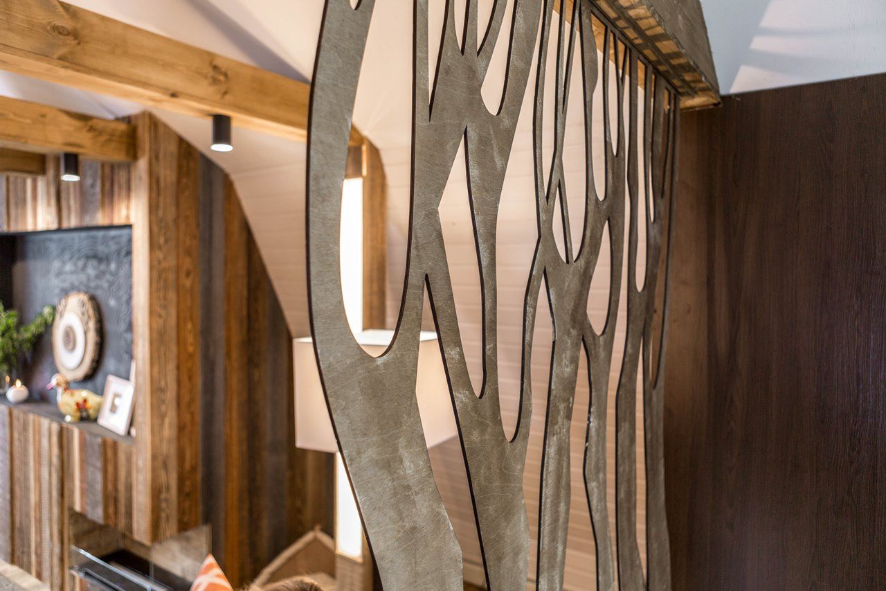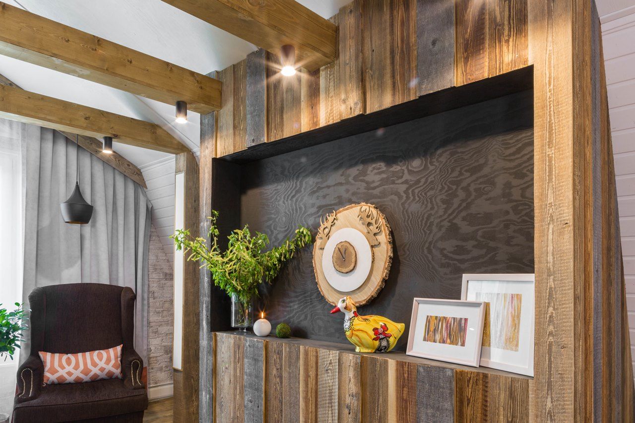 Новые идеи в телепроекте "Фазенда" на мансарде в 42 квадратных метра появилась лесная гостиная. На стене – лес еловый. Есть даже пенек. Перегородка - с осиновой рощей… Дерево, камень, камин. Почти классическое шале. Освещение в гостиной реализовано различными светодиодными светильниками.