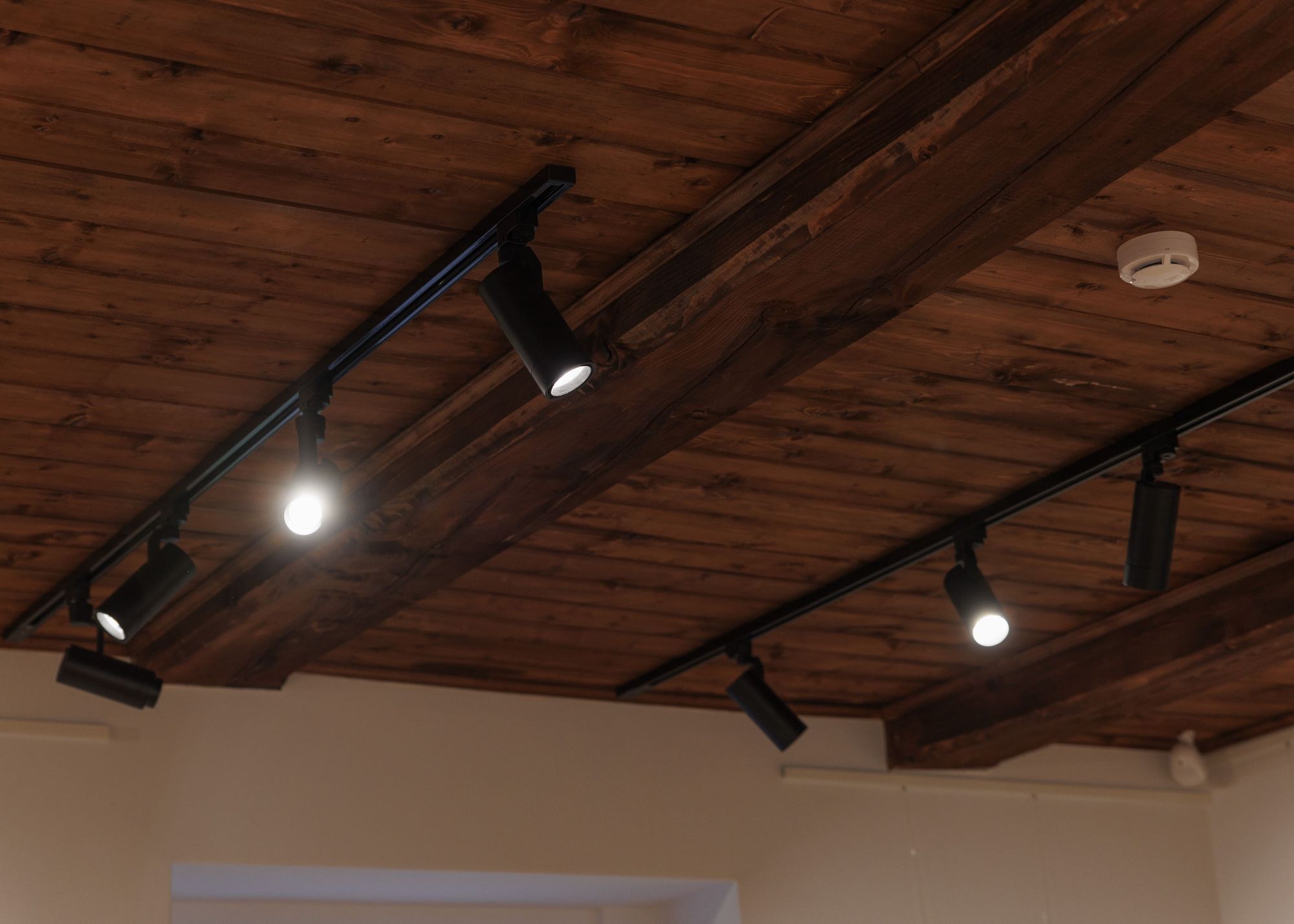 Современные треки и светильники в черном цвете гармонично вписались в аутентичный интерьер: линии треков размещены параллельно потолочным перекрытиям, тем самым не нарушая геометрию пространства.