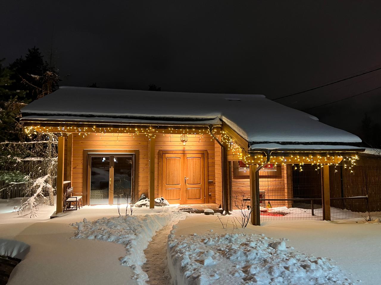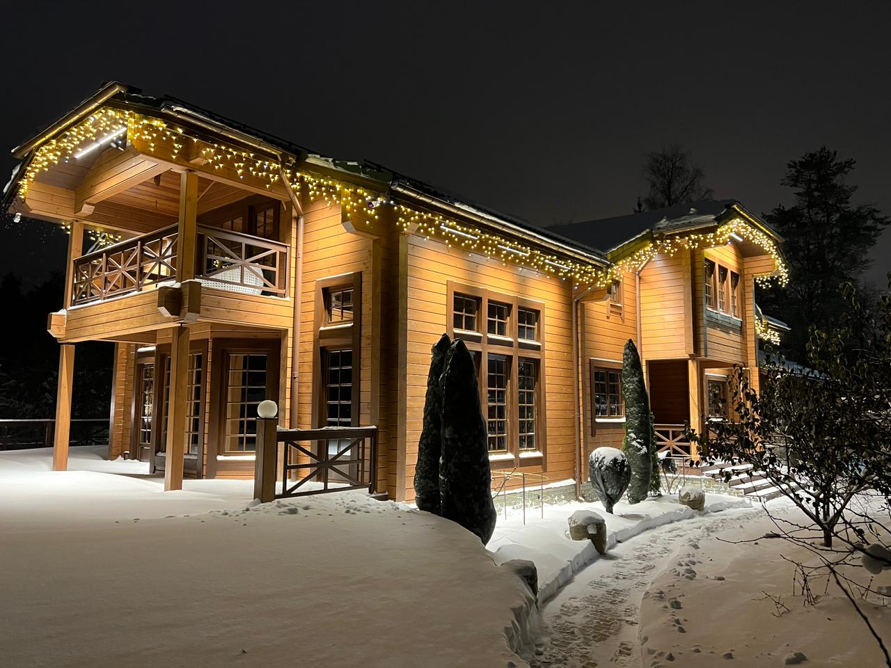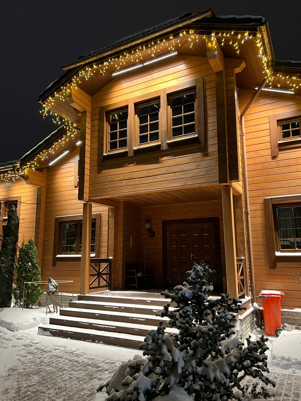 Была использована уличная светодиодная гирлянда «БАХРОМА» серии Pro с теплым белым светом и эффектом мерцания. Такое освещение круглый год будет дарить ощущение праздника и уюта.
