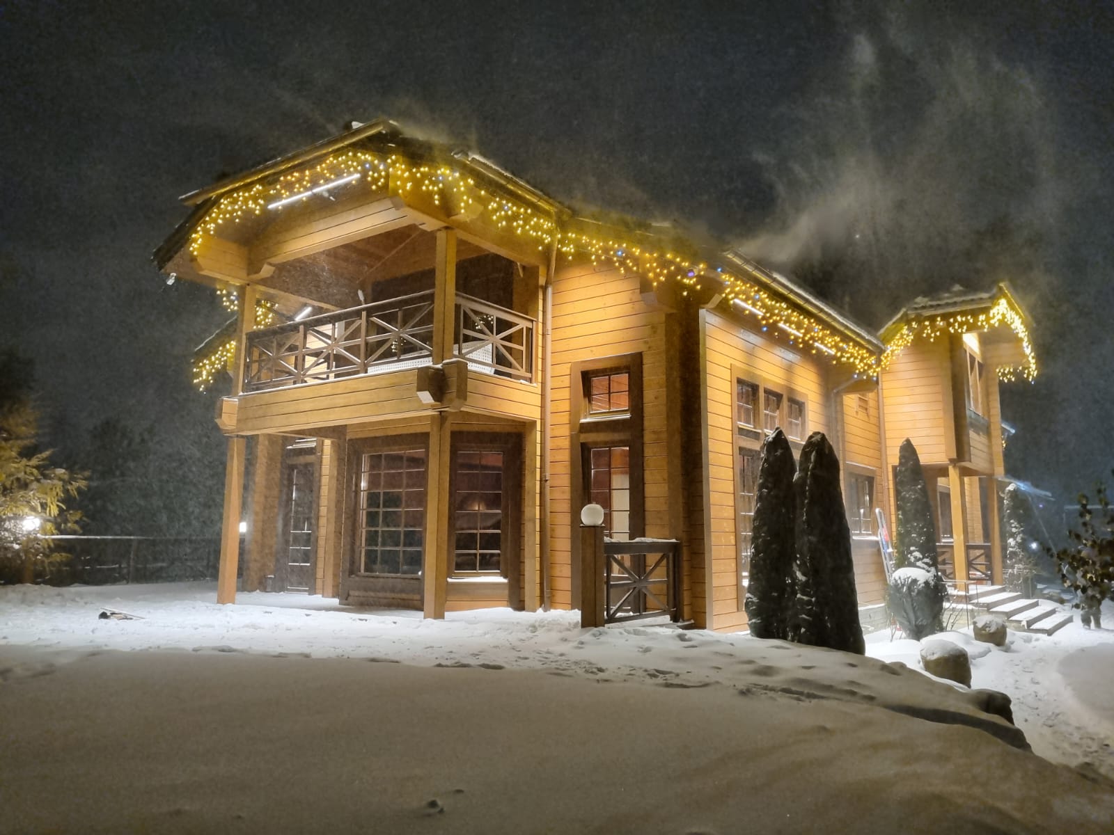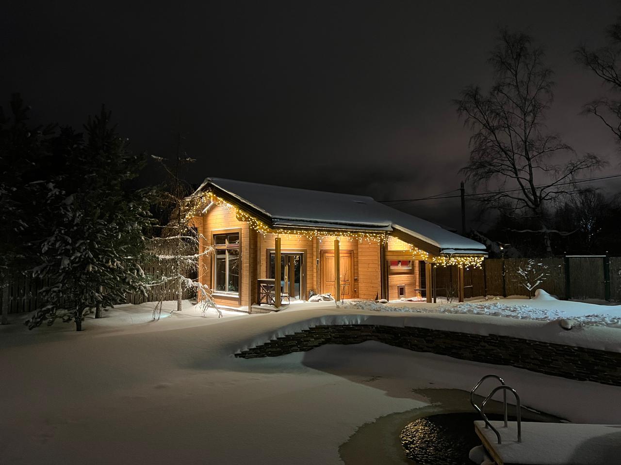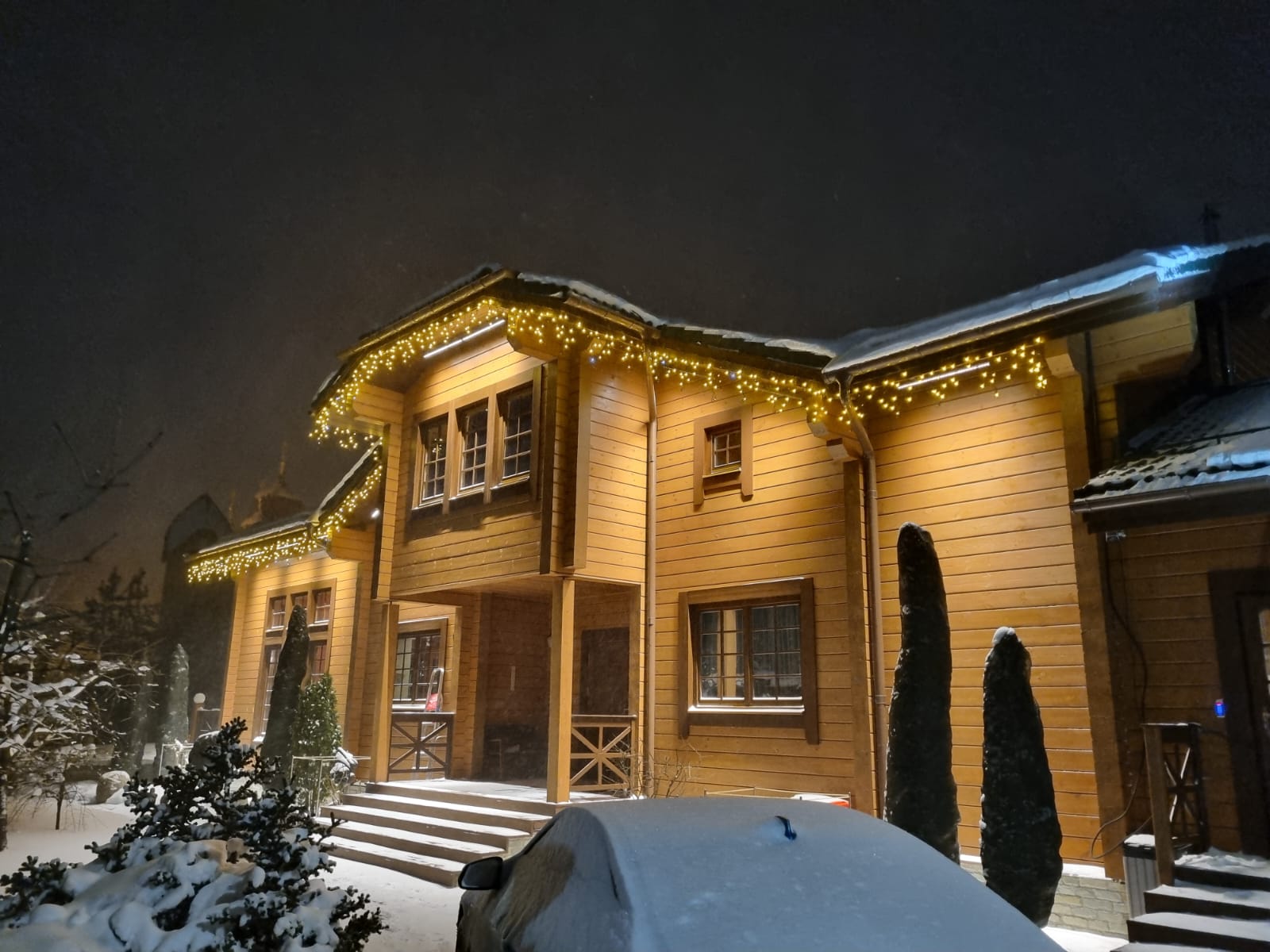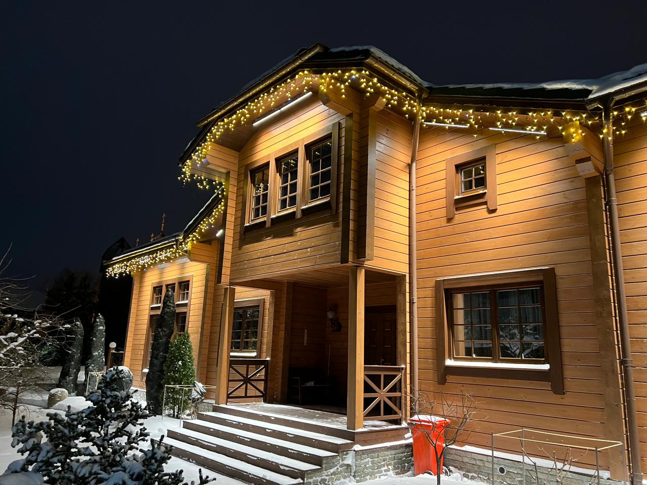 Была использована уличная светодиодная гирлянда «БАХРОМА» серии Pro с теплым белым светом и эффектом мерцания. Такое освещение круглый год будет дарить ощущение праздника и уюта.