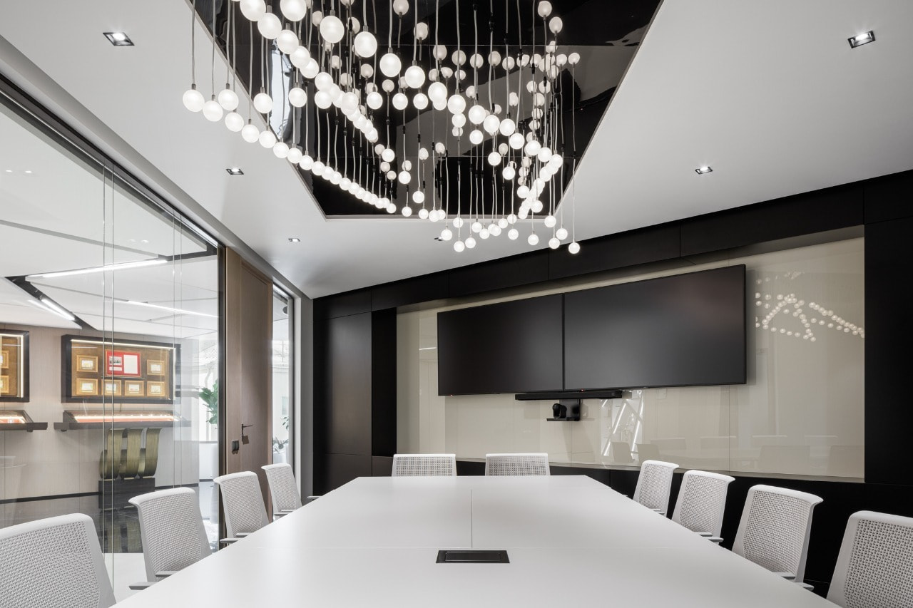 В некоторых переговорных функциональные источники освещения гармонируют со стильными декоративными люстрами. Шарообразные элементы люстр создают неформальный настрой и легкость, которые помогут разрядить даже самую напряженную обстановку.