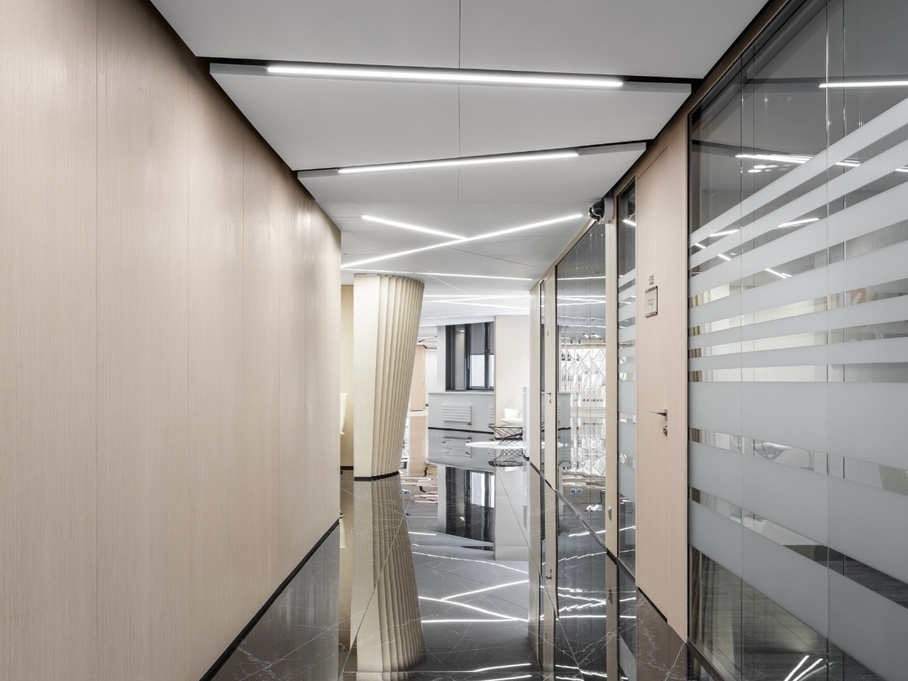 Дизайн и функциональность освещения в каждом помещении тщательно продуманы. Встроенные световые линии в холлах и коридорах представляют собой слегка хаотичные геометрические штрихи. С одной стороны, линии света с нейтральным белым цветом свечения (4000 К) выглядят строго, с другой — благодаря их асимметричному расположению создается непринужденная атмосфера.