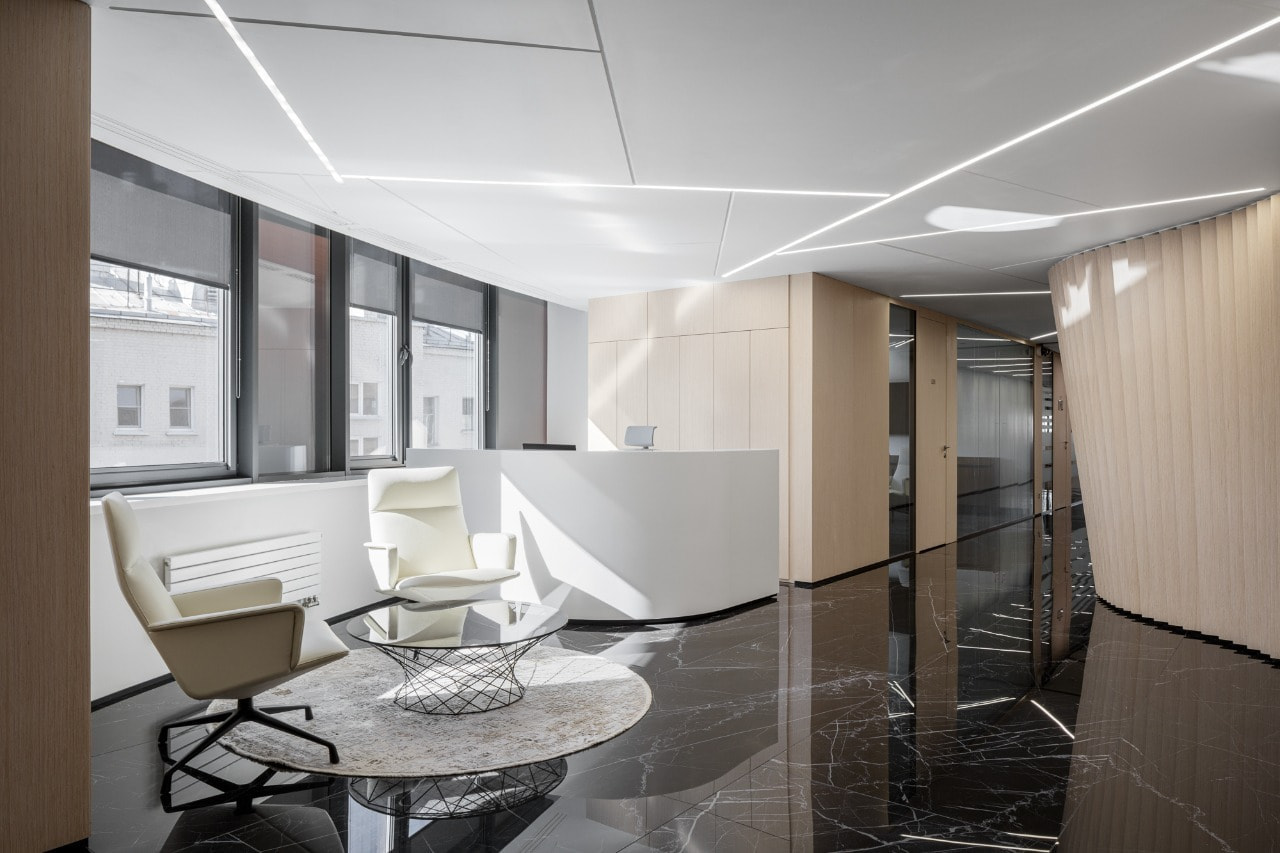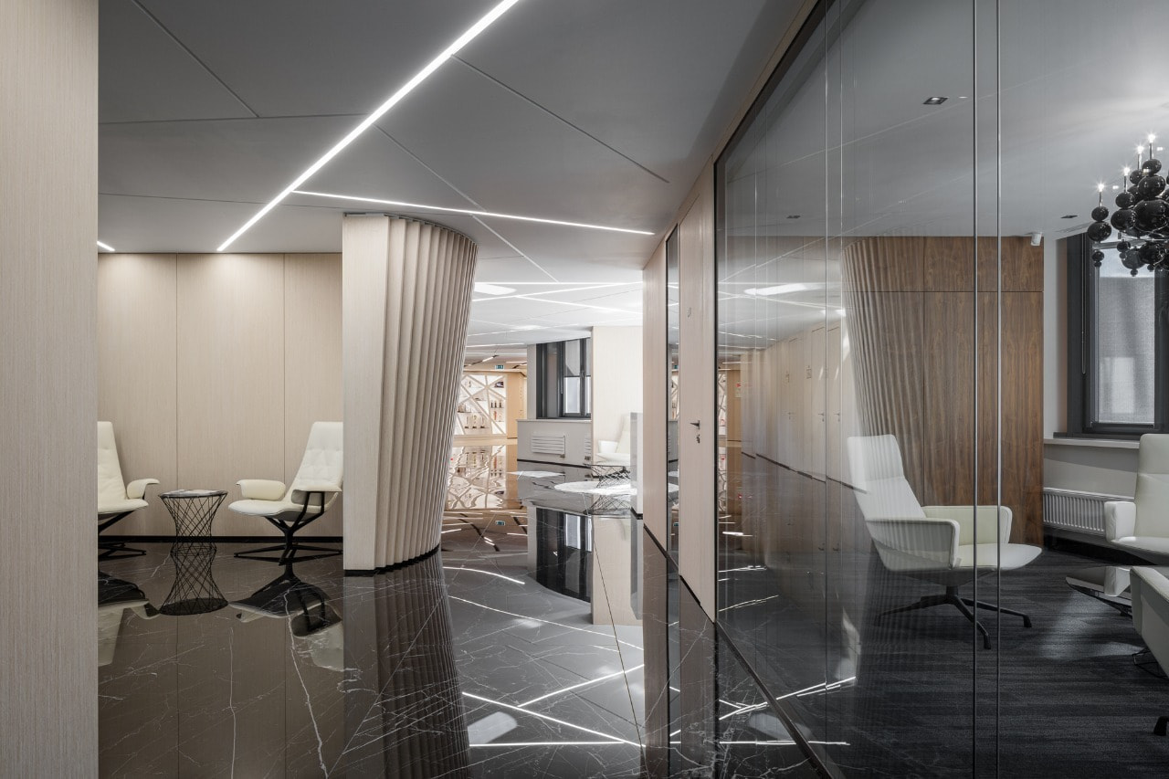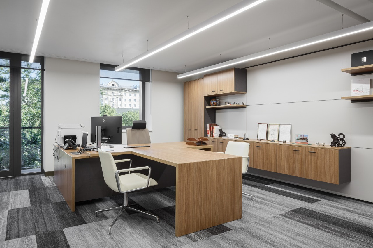 Интерьер просторного современного офиса «ЛЛК-Интернешнл» воплощает в себе гармонию цветов и оттенков.