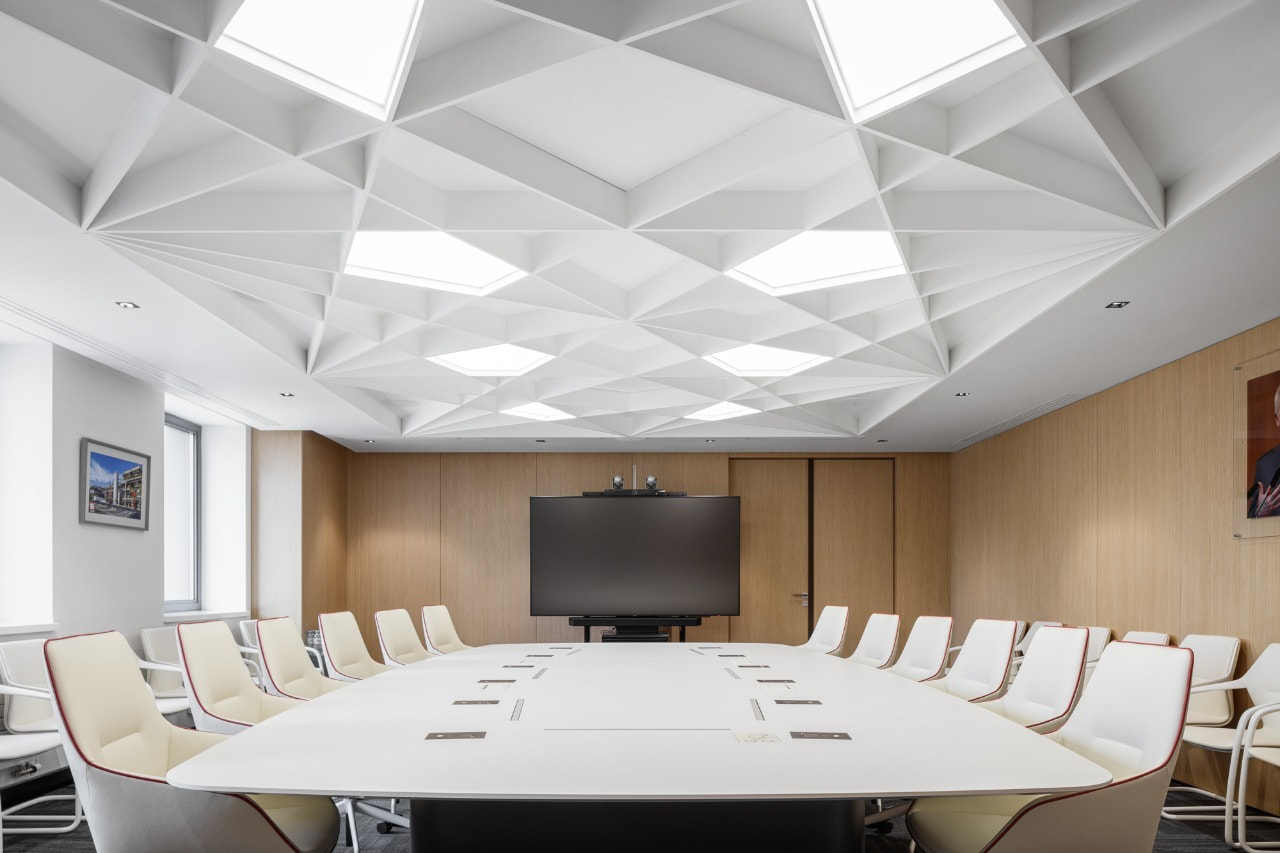 Концепция геометричности ненавязчиво прослеживается и в других зонах офиса: где-то это орнамент на стене, а где-то — декоративные геометрические конструкции из реек на потолке, как, например, в одной из переговорных комнат и в столовой.