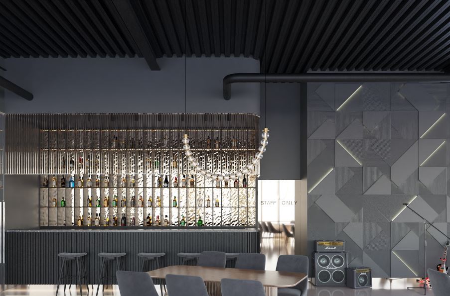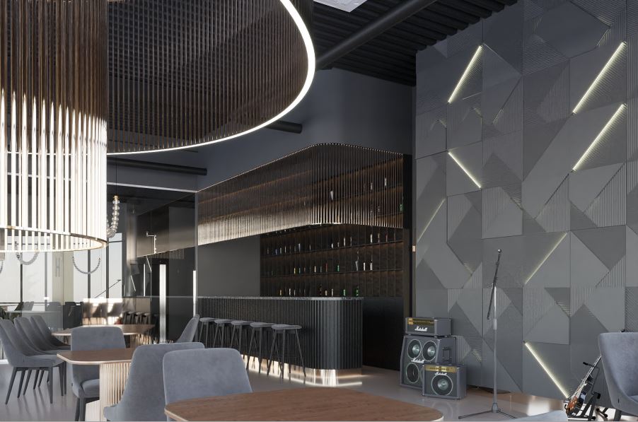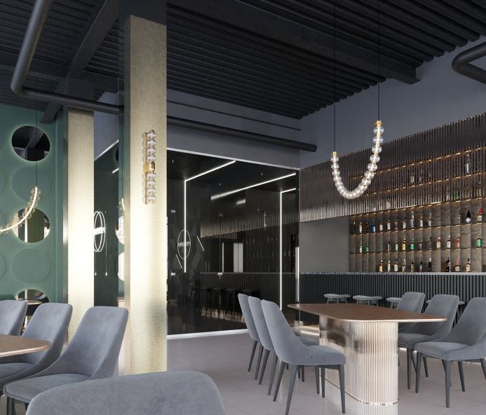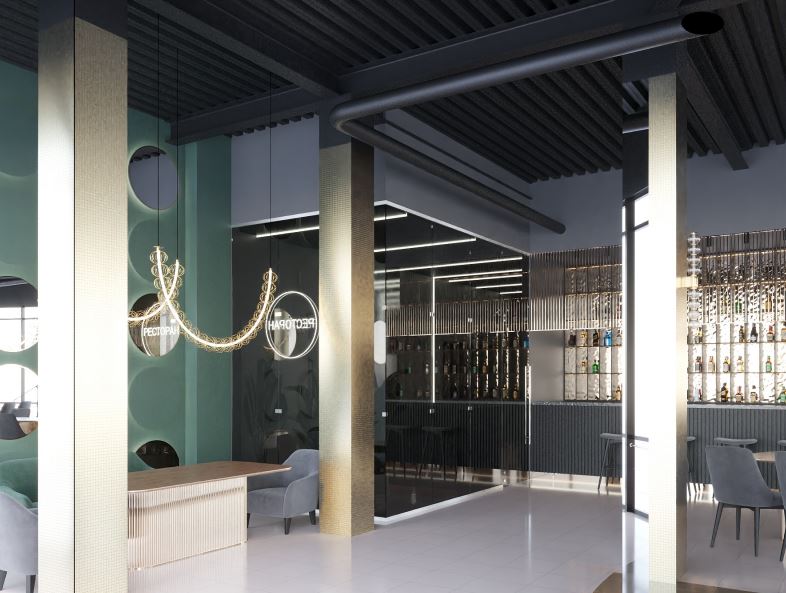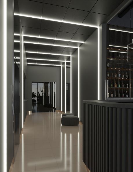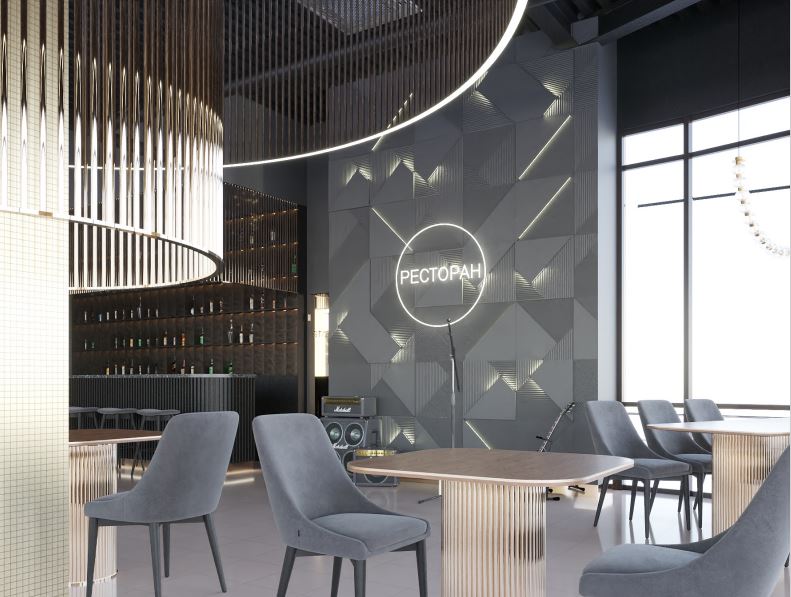 С помощью светодиодных лент подсветили коридор, барную стойку, большую люстру в центре зала и декоративную стену, раковины и потолок в санузлах. С помощью трековых и декоративных светильников организовали освещение зала.