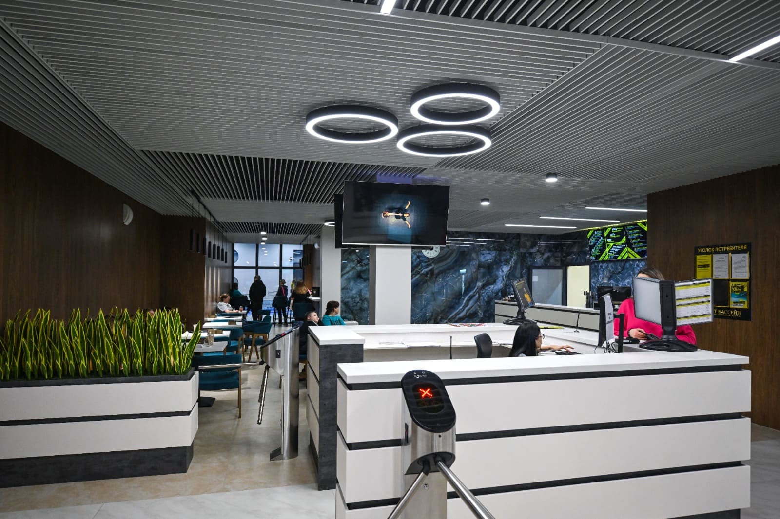 Чтобы гармонично вписаться в интерьер и не перегрузить спортивный комплекс «Арт Бассейн» строгой геометрией, были подобраны соответствующие источники освещения.