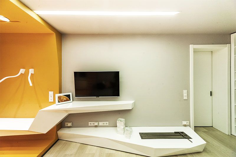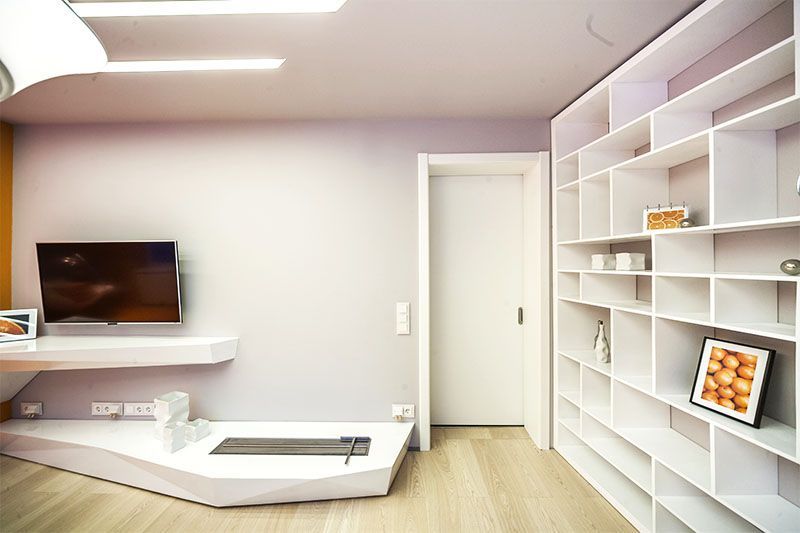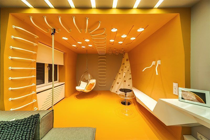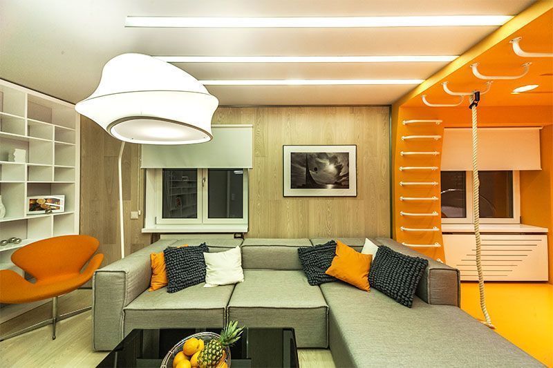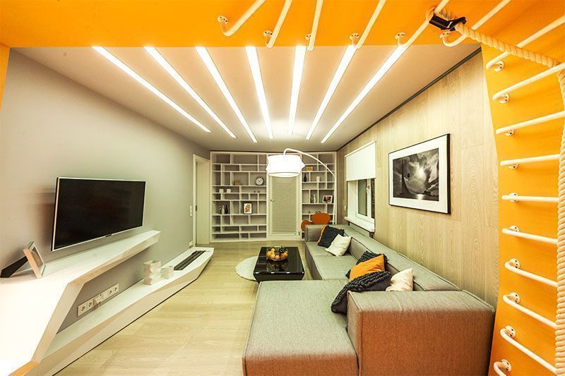Контраст между двумя зонами подчеркнут и освещением: в потолок спортивной зоны утоплены функциональные светодиодные светильники-споты arlight®, а в потолок над зоной отдыха встроены эффектные световые полосы, которые служат основным источником света.Полосы сделаны на основе светодиодной ленты arlight®, установленной в алюминиевый профиль и закрытой матовым экраном для создания эффекта мягкой непрерывной световой линии. В комнате также появились локальные источники света: торшер и гибкие бра.