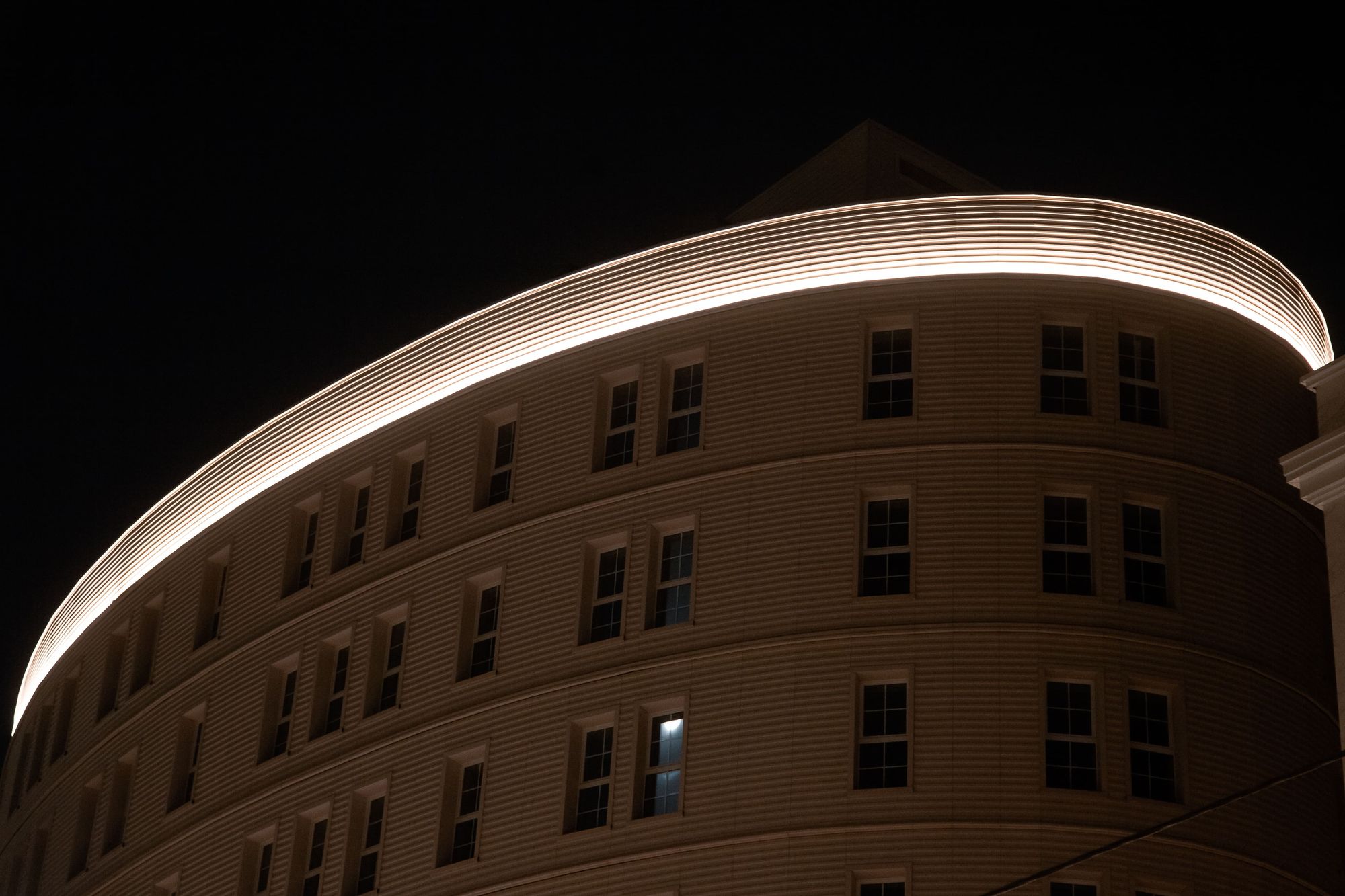 Подсветка фасадов выполнена на основе герметичной светодиодной ленты ARL PV C72 с цветовой температурой 3000 К. Теплый белый цвет свечения создает уютный и умиротворяющий облик здания и хорошо подходит для акцента классических декоративных элементов. Округлый орнамент на фризе оживает в свете подсветки, а рифленая поверхность фасада приобретает объем. Широкая подсветка верхнего и нижнего контура одного из корпусов плавно очерчивает строение в темное время суток.